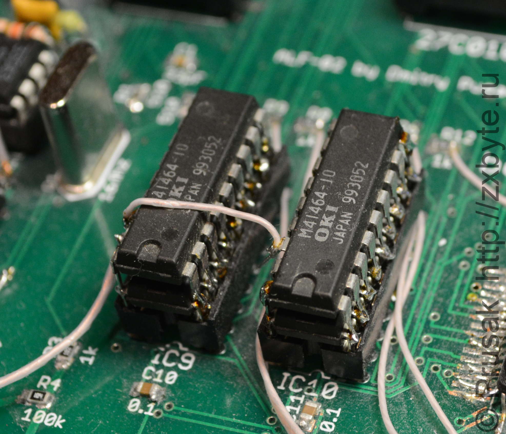 Первое, что делаем - напаиваем поверх имеющихся микросхем ОЗУ ещё по одной микросхеме памяти такого же типа. Выводы 16 (сигнал /CAS) не паяем, а отгибаем и соединяем эти отогнутые выводы на двух напаиваемых микросхемах между собой. На них будет подаваться сигнал /CAS2 с платы расширения памяти.