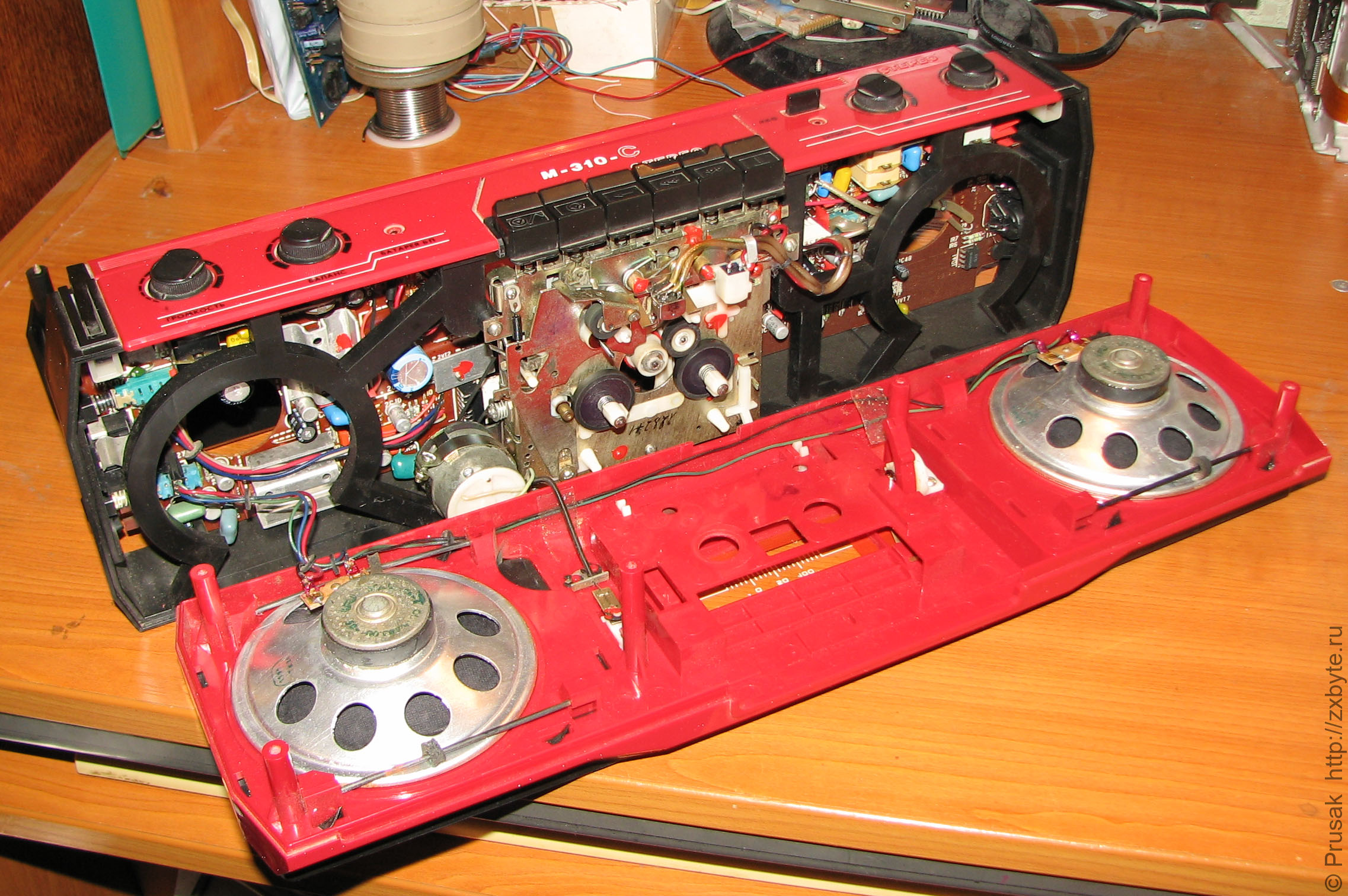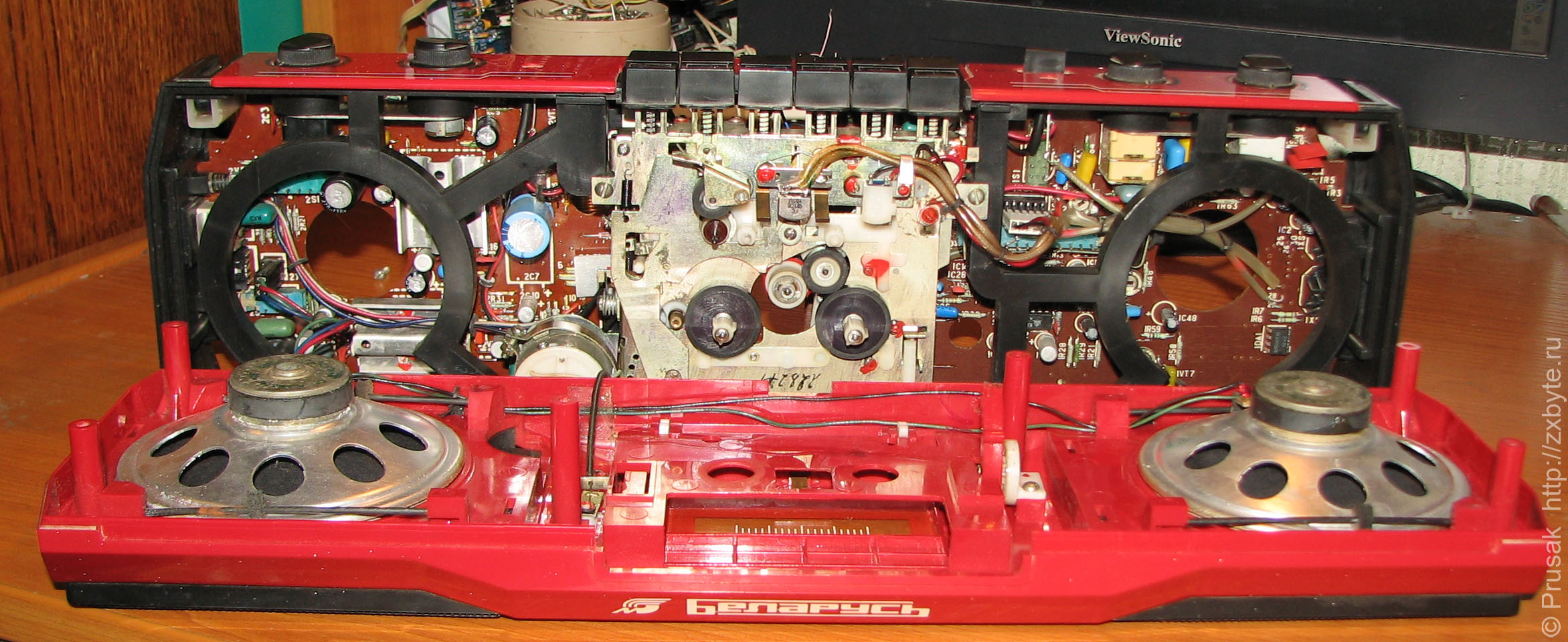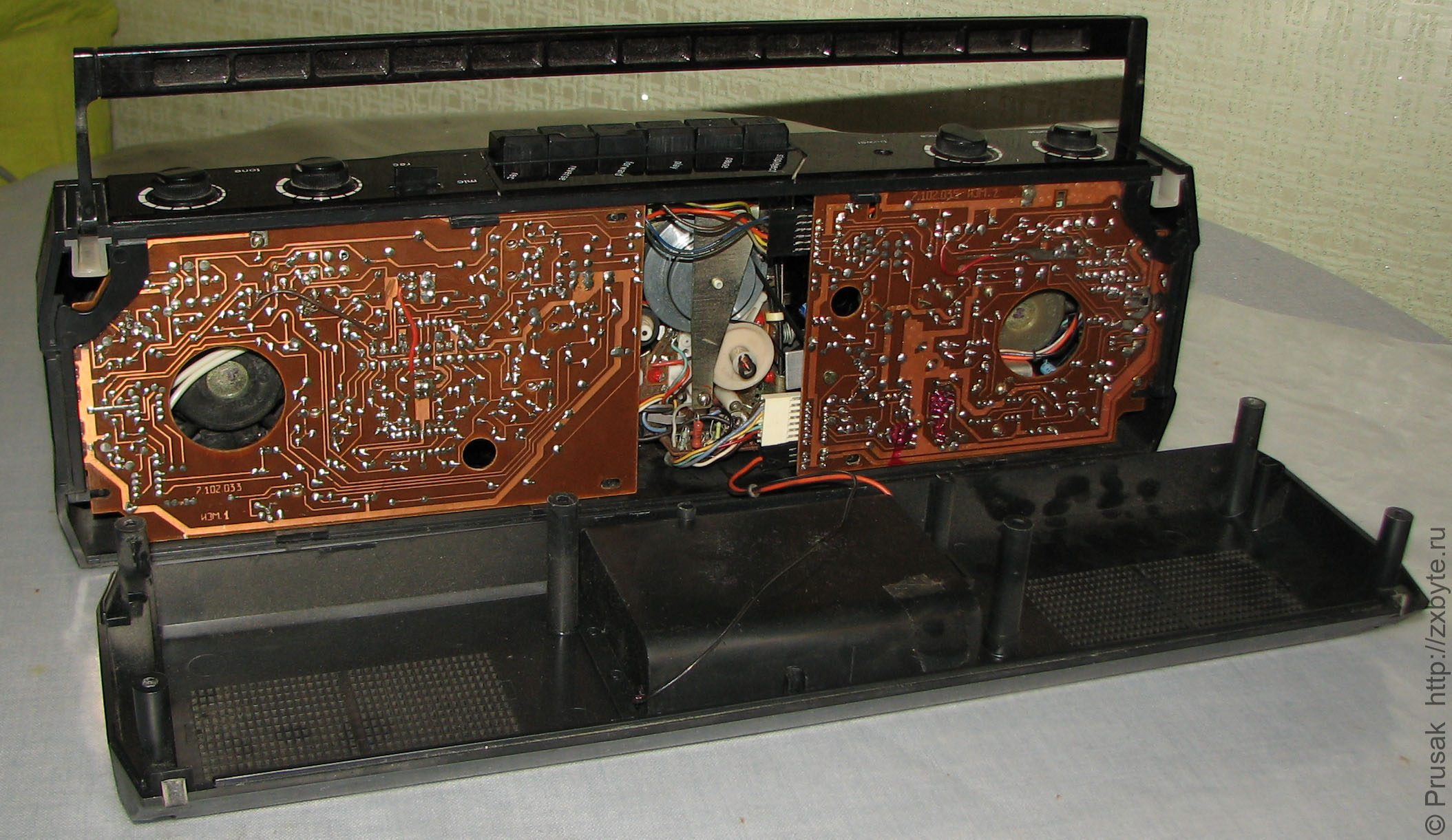 Магнитофон имеет раскладывающуюся конструкцию. Т.е. после откручивания шести саморезов, скрепляющих корпус, магнитофон "распадается" на три части - переднюю панель, среднюю часть с платами и ЛПМ и заднюю крышку с батарейным отсеком.