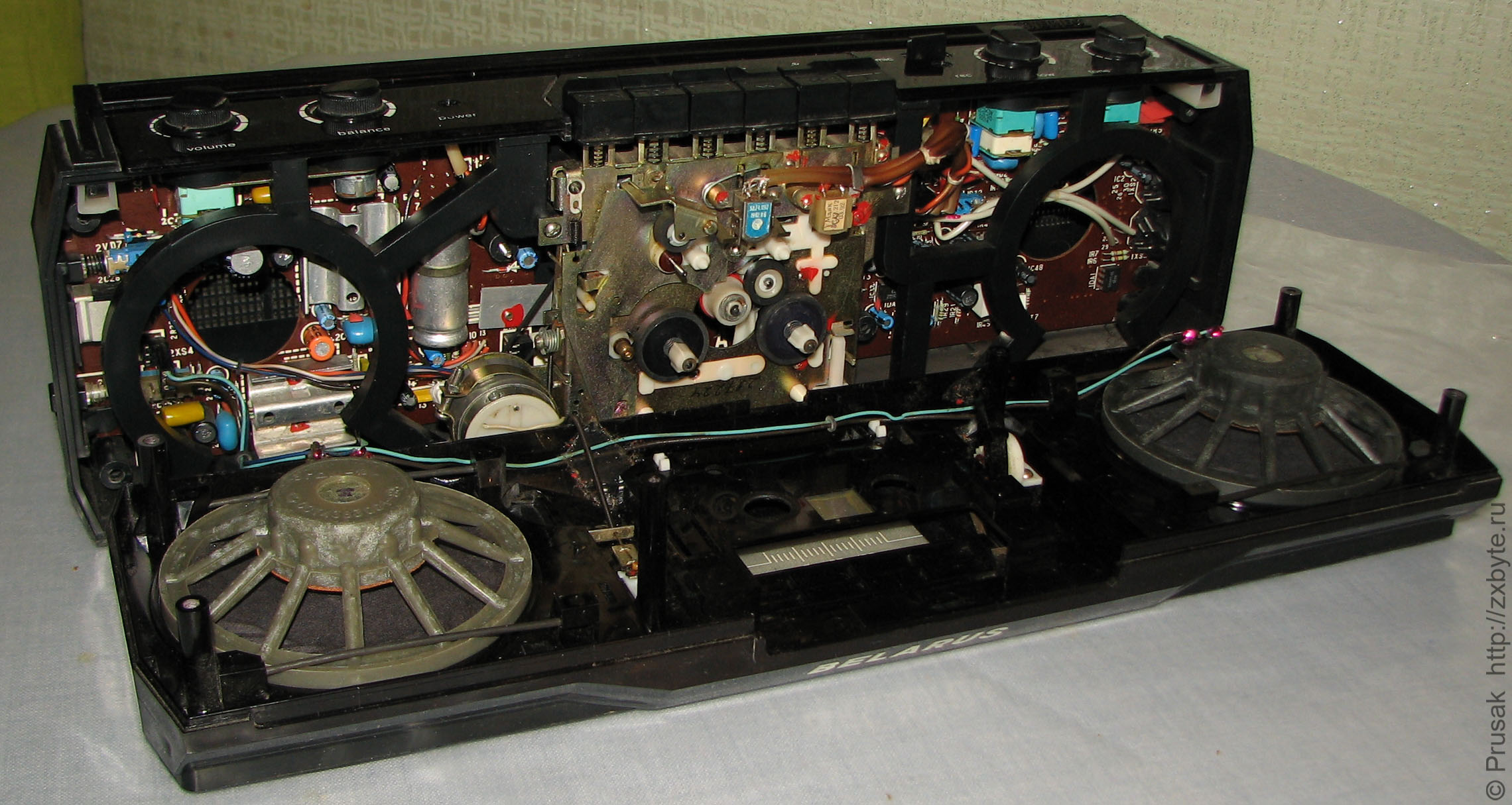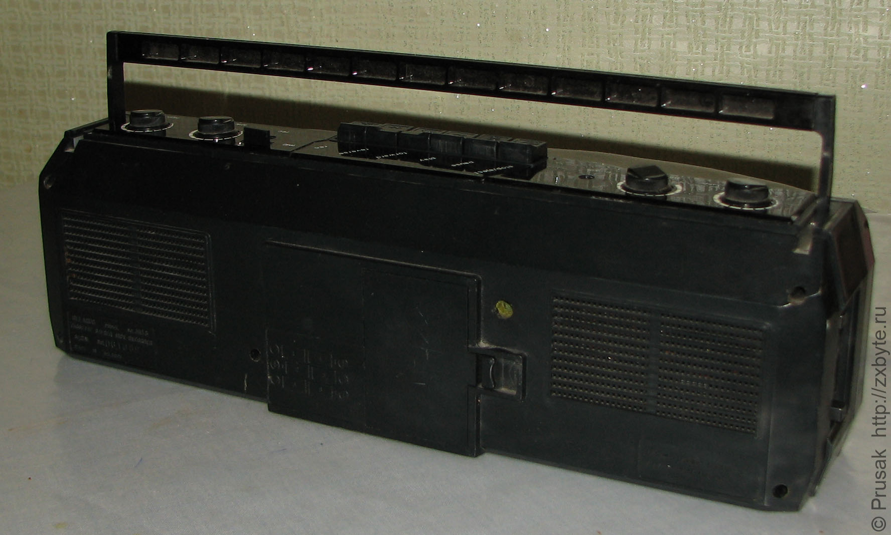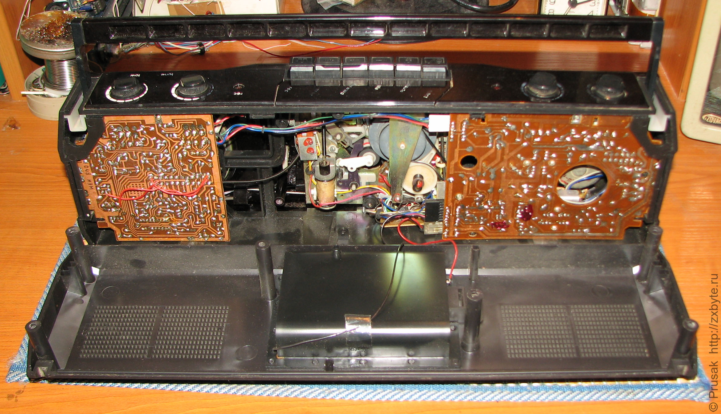 Магнитофон имеет раскладывающуюся конструкцию. Т.е. после откручивания шести саморезов, скрепляющих корпус, магнитофон "распадается" на три части - переднюю панель, среднюю часть с платами и ЛПМ и заднюю крышку с батарейным отсеком.
