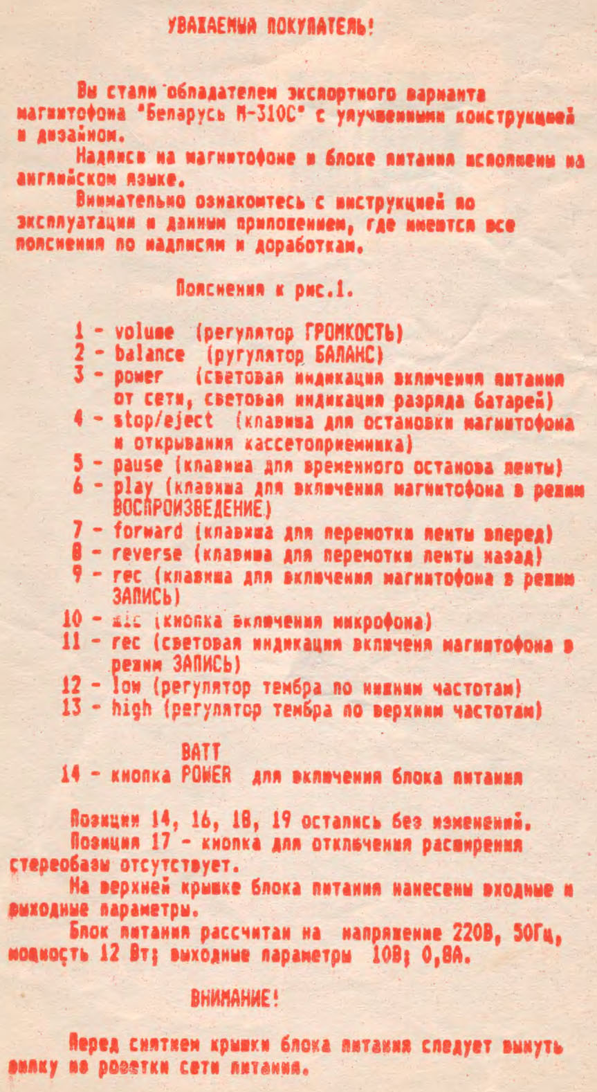 Памятка владельцу экспортного варианта магнитофона Беларусь