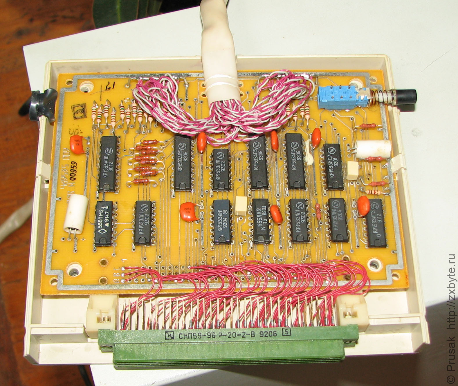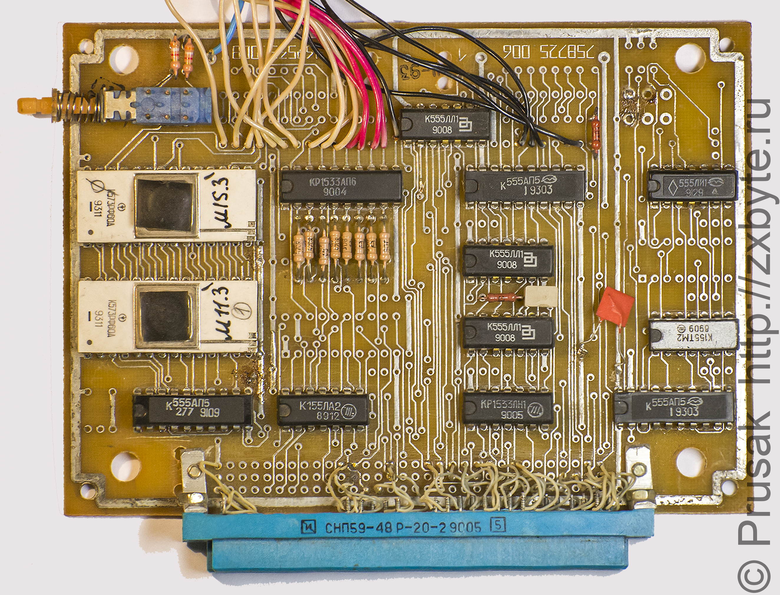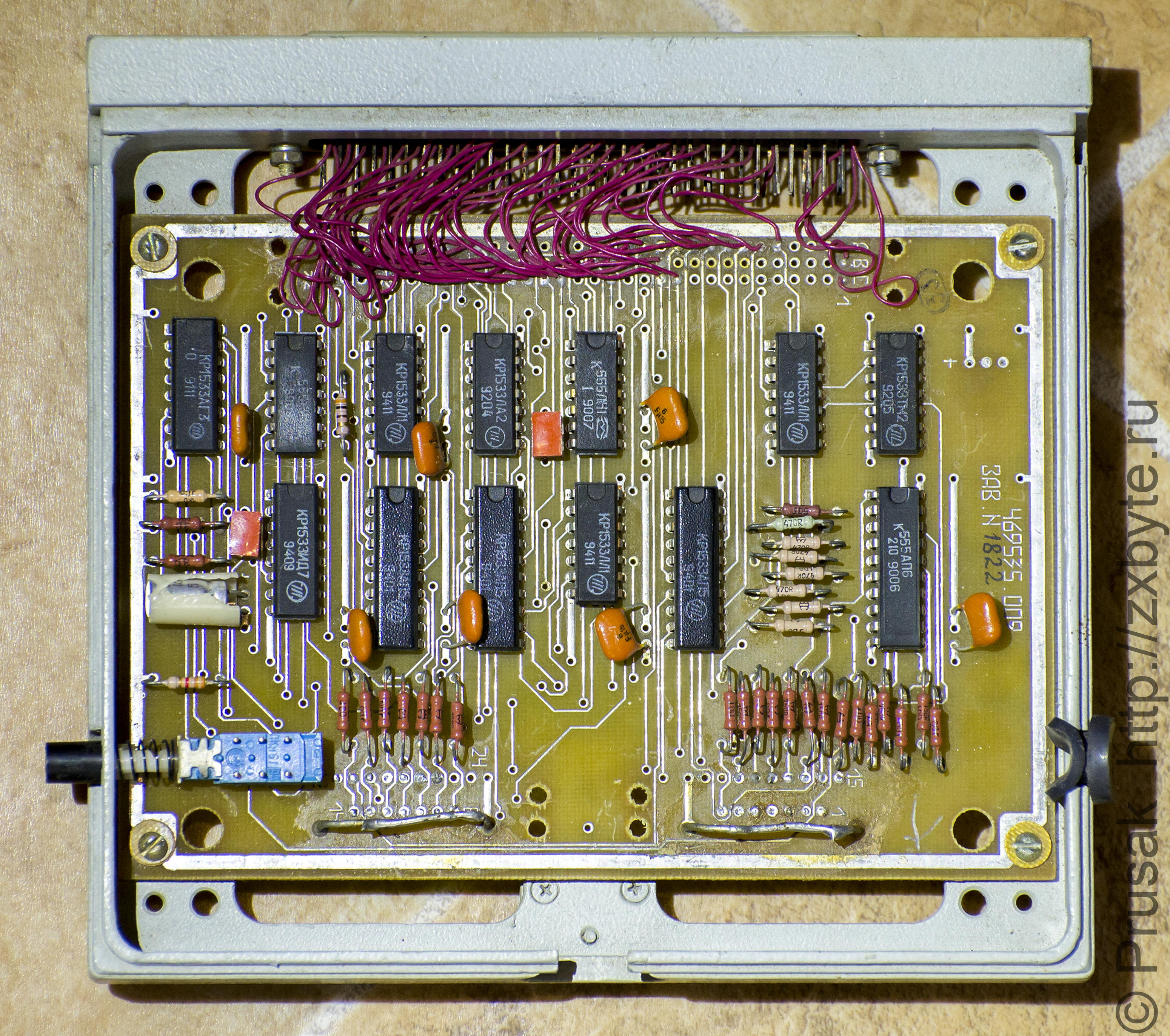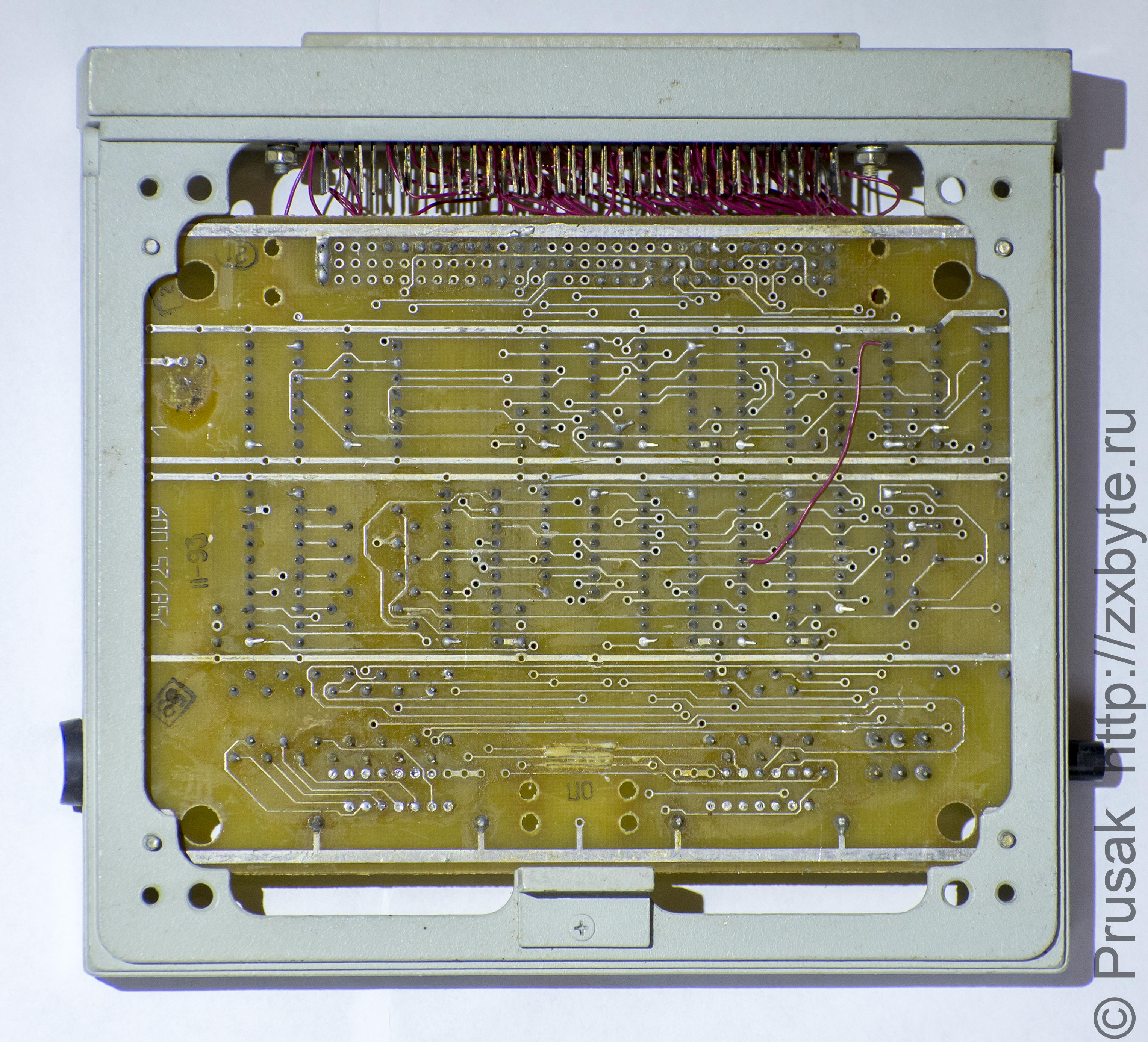 Адаптер осуществляет буферирование сигналов процессора и формирование некоторых специфических сигналов для работы с КВУ. Также в адаптере расположена схема дешифрации регистра конфигурации компьютера. Монтаж проводов на системном разъёме выполнен накруткой.