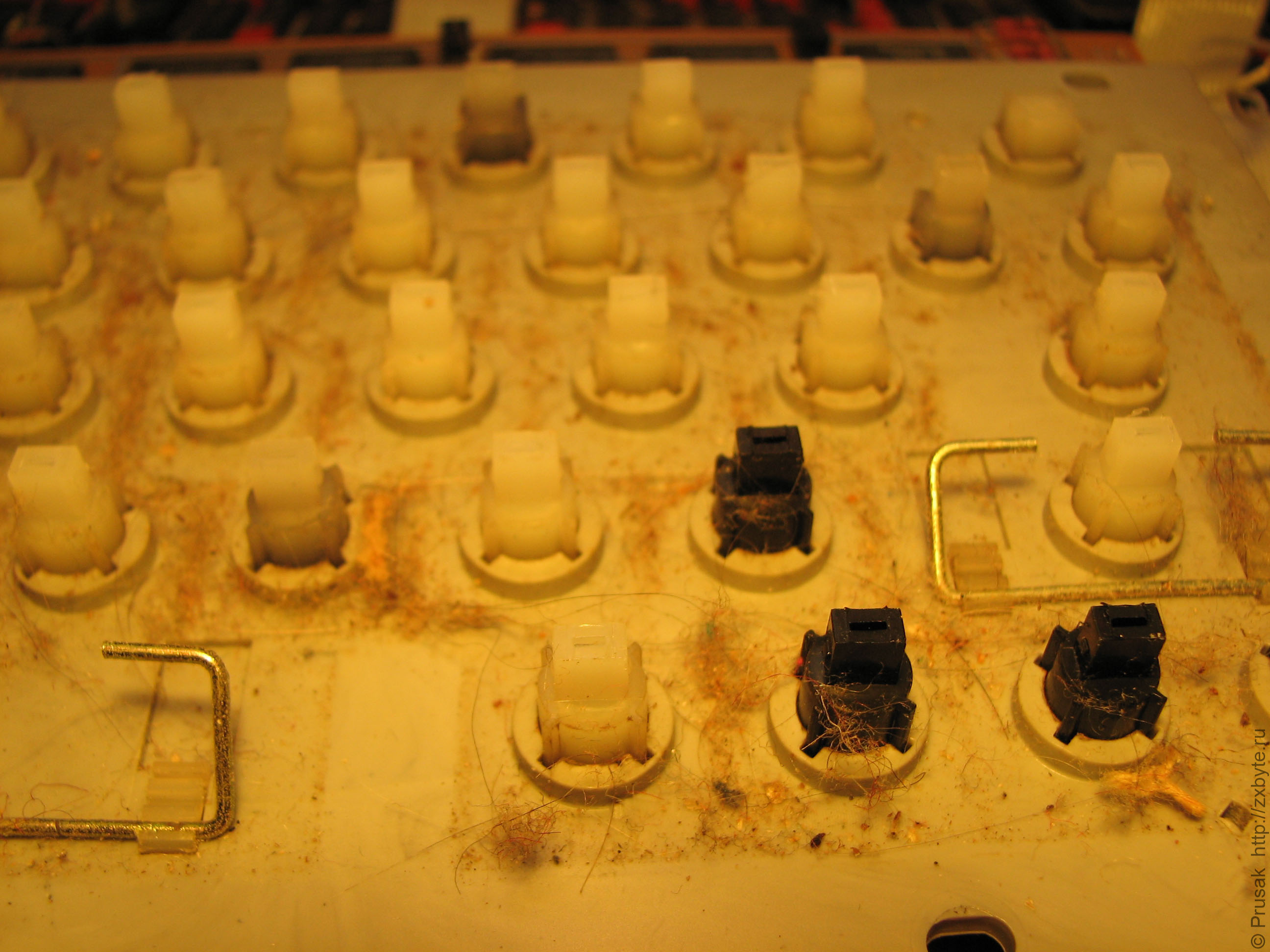 Вынимаем всё толкатели и складываем их куда-нибудь, чтобы не рассыпать. Толкатели, как правило, мыть не надо, они почти всегда чистые. Главное - не потерять ни одного при разборке. Теперь можно отмыть пластмассовое основание клавиатуры: