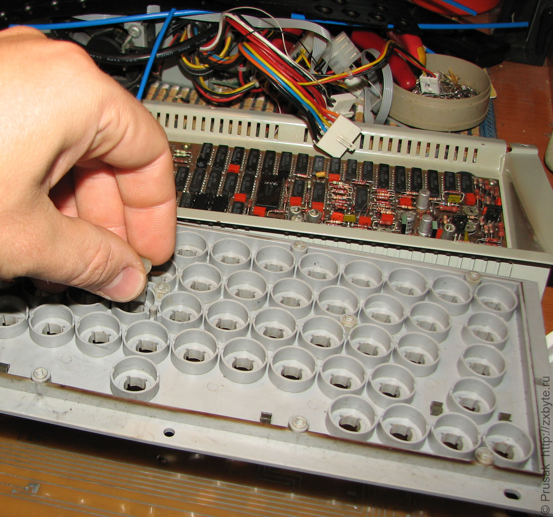 И сверху ставим плату клавиатуры. Это надо делать аккуратно, чтобы не выдавить ненароком толкатели. Точную установку платы обеспечивают два ловителя: