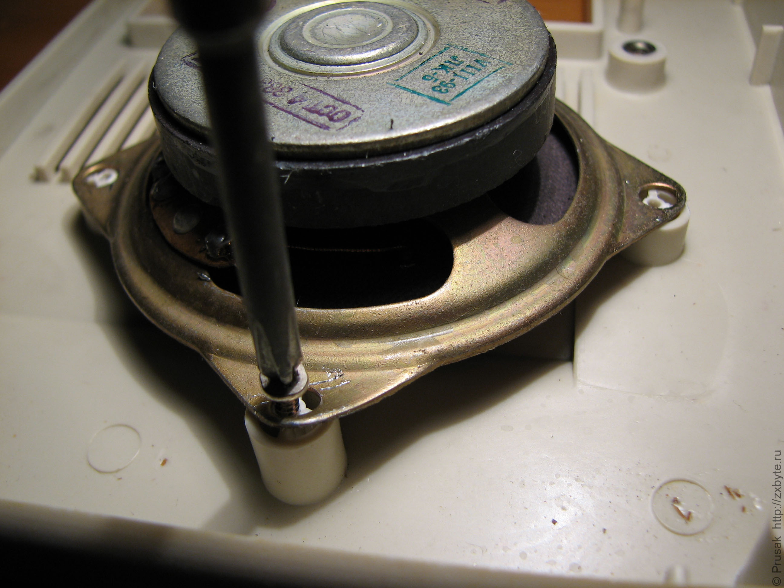 Если передняя панель высохла, поставим на неё динамик. Закрепим его на 4 самореза, под которые заранее высверлили отверстия: