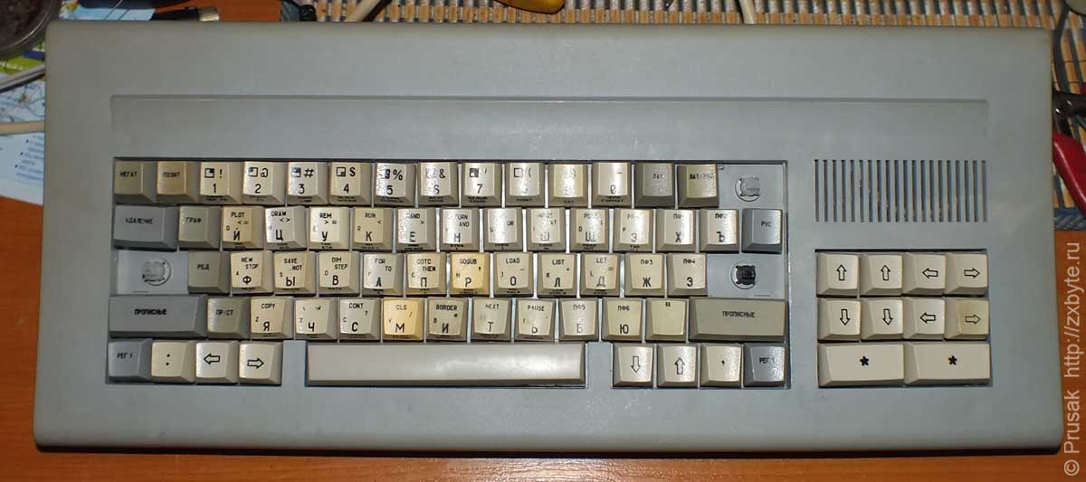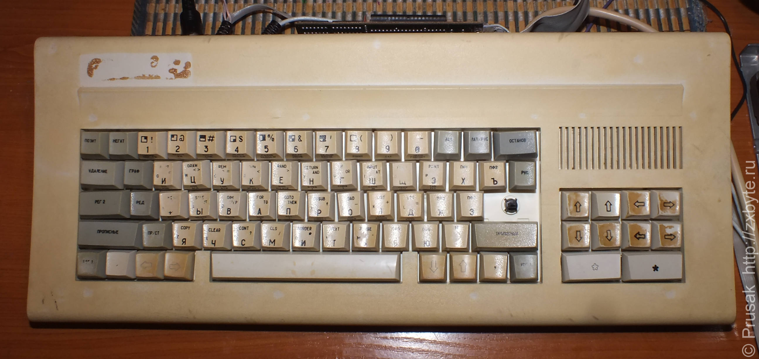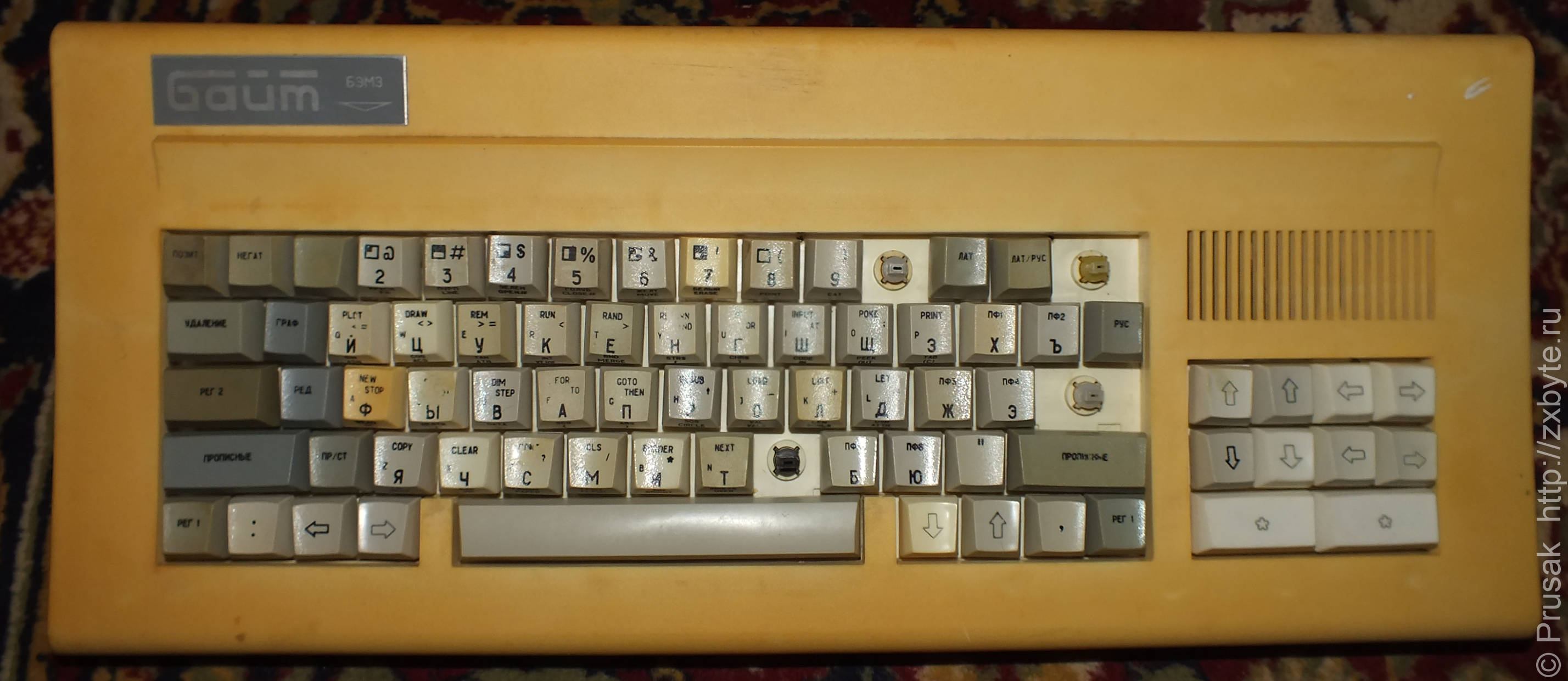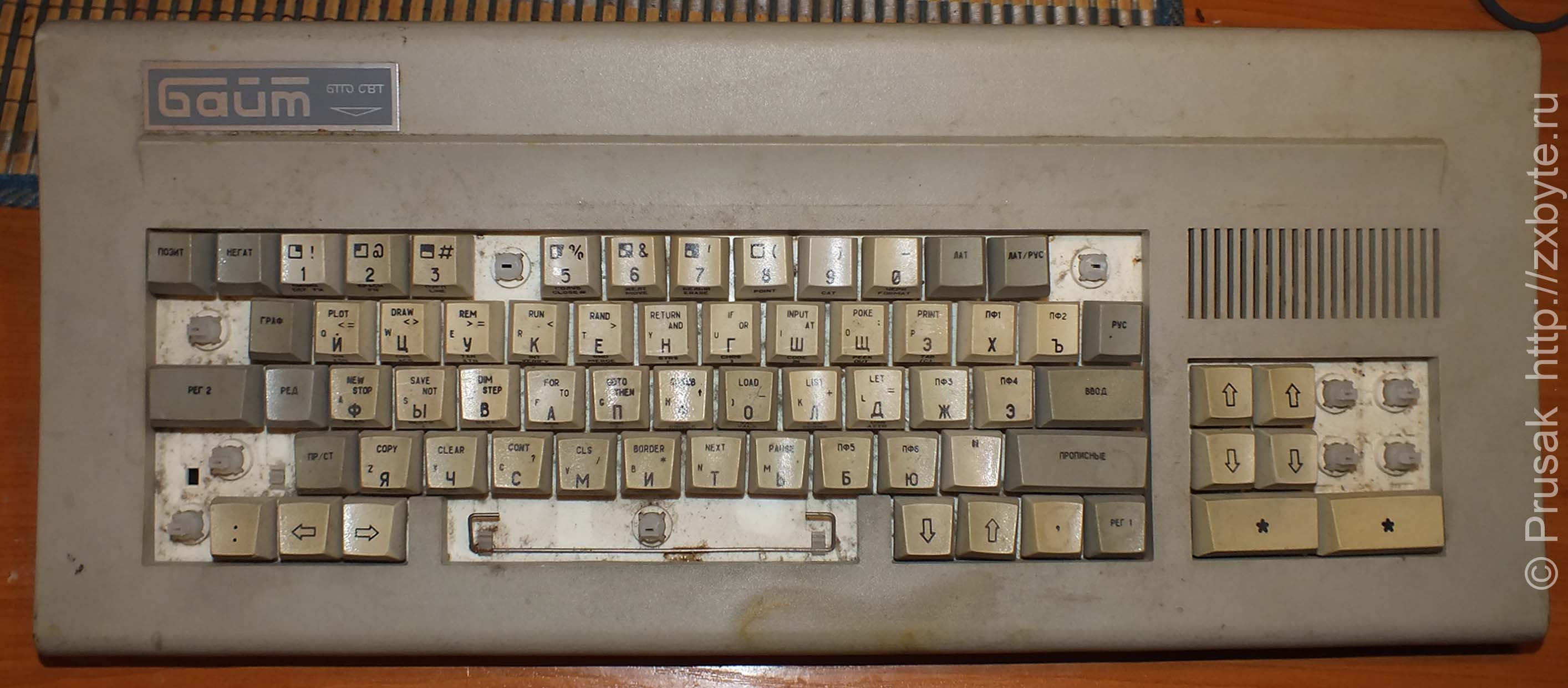Когда компьютер попал ко мне, он был без корпуса и клавиатуры. Пришлось из остатков запчастей ставить то, что было под рукой. Как видно, клавиши идут "вразнобой" - то желтые, то белые, то с лазерной гравировкой, то без неё. Мои запасы запчастей не безграничны, и на этом экземпляре "Байта" они почти закончились. Но радует то, что ещё один "Байт" спасён от свалки.