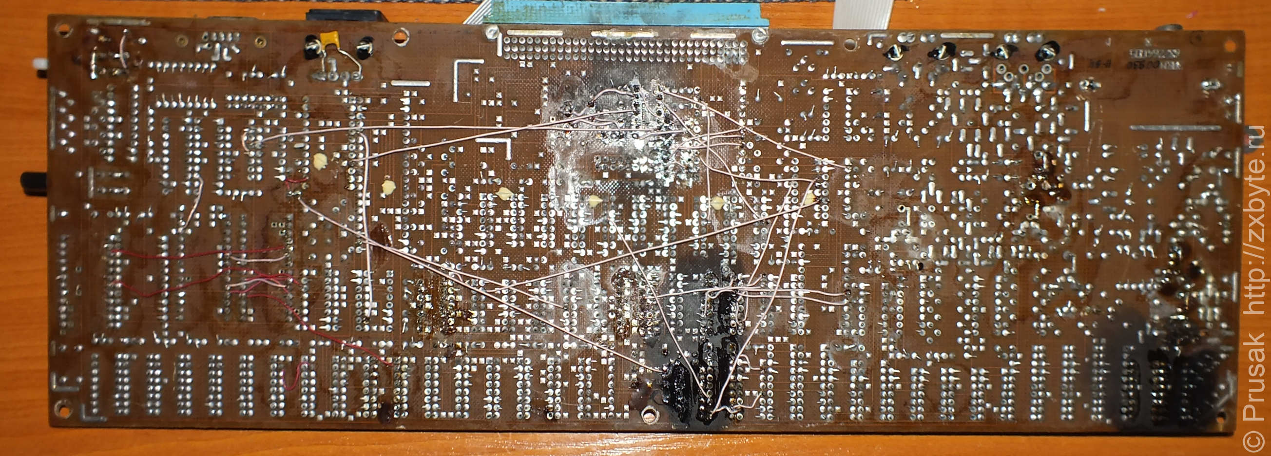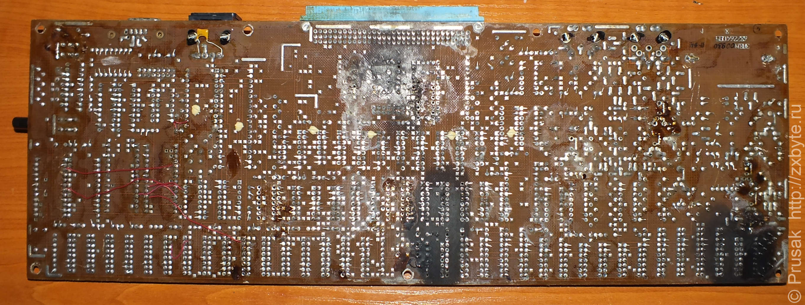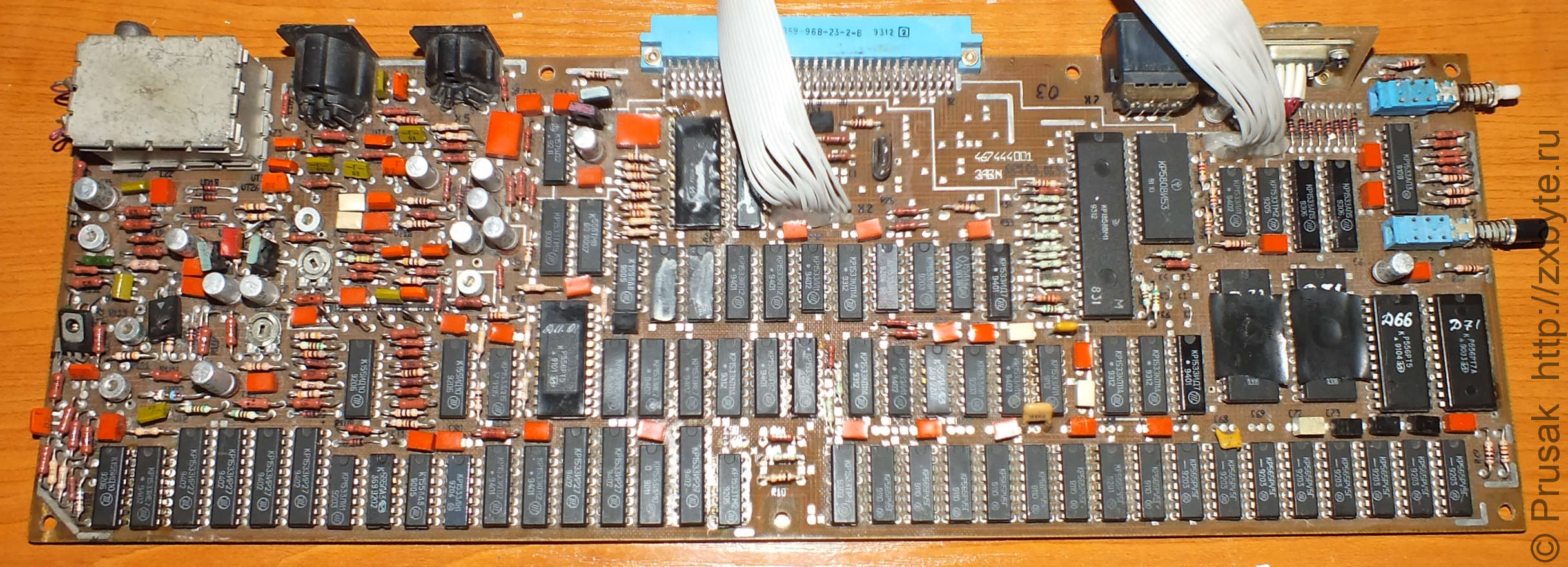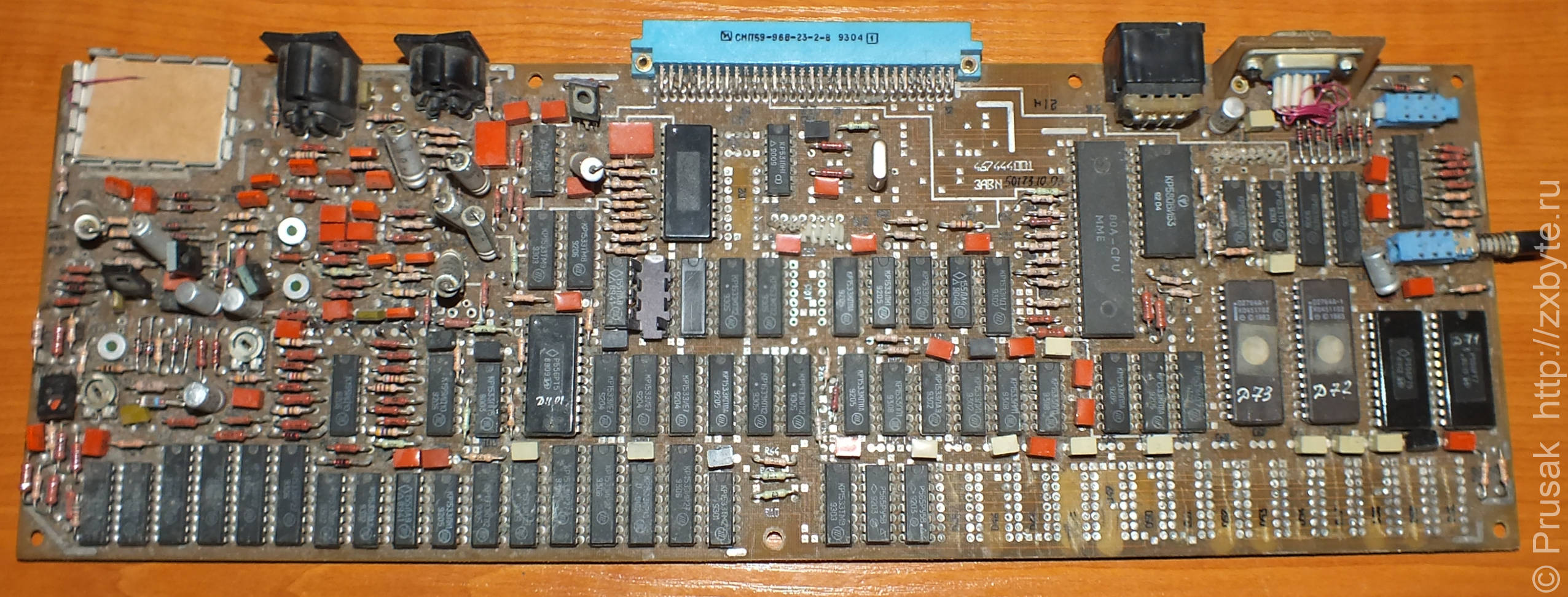 Поциент до лечения. На плате компьютера виден белый провод доработки для подключения TR-DOS. В левой части платы проводом МГТФ сделана инверсия синхросигнала для нормального подключения к телевизорам