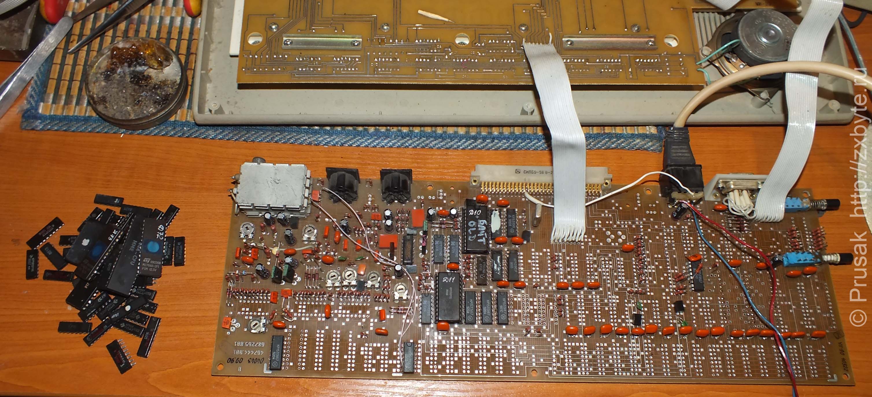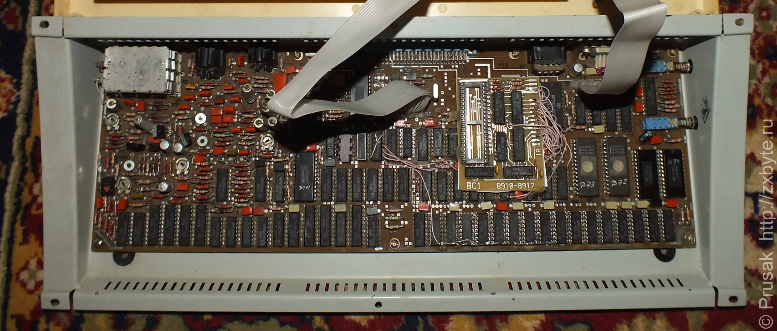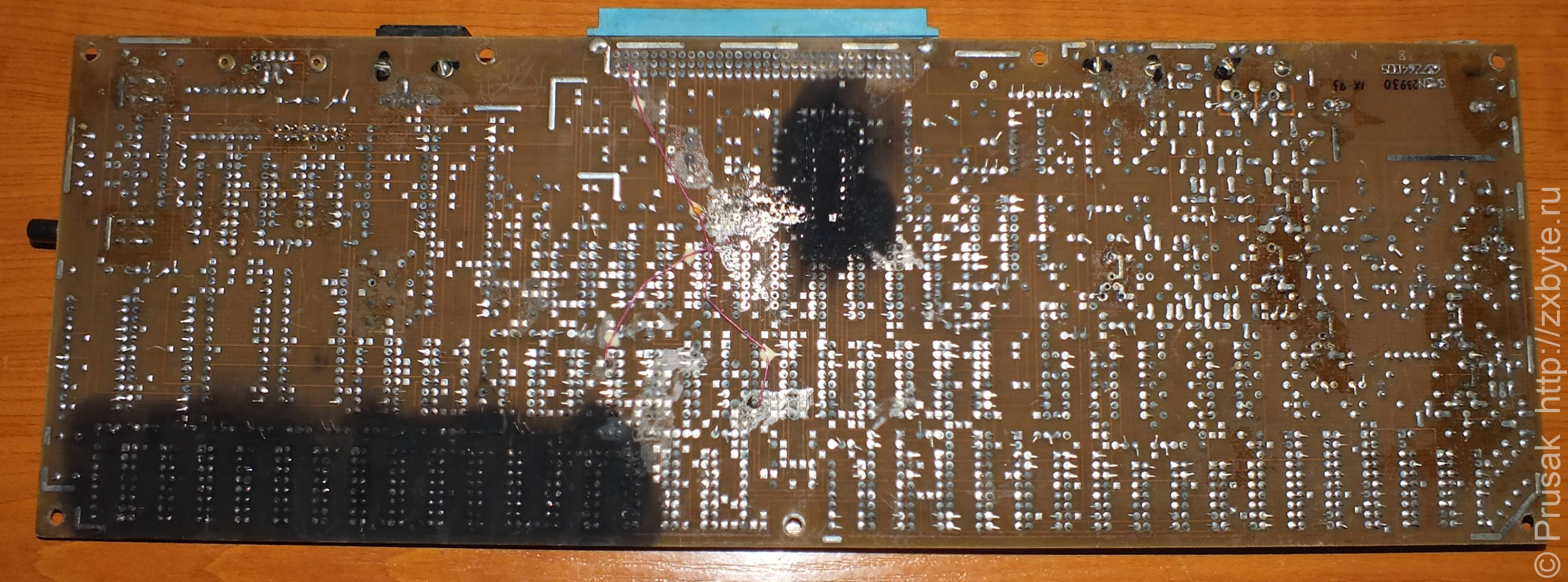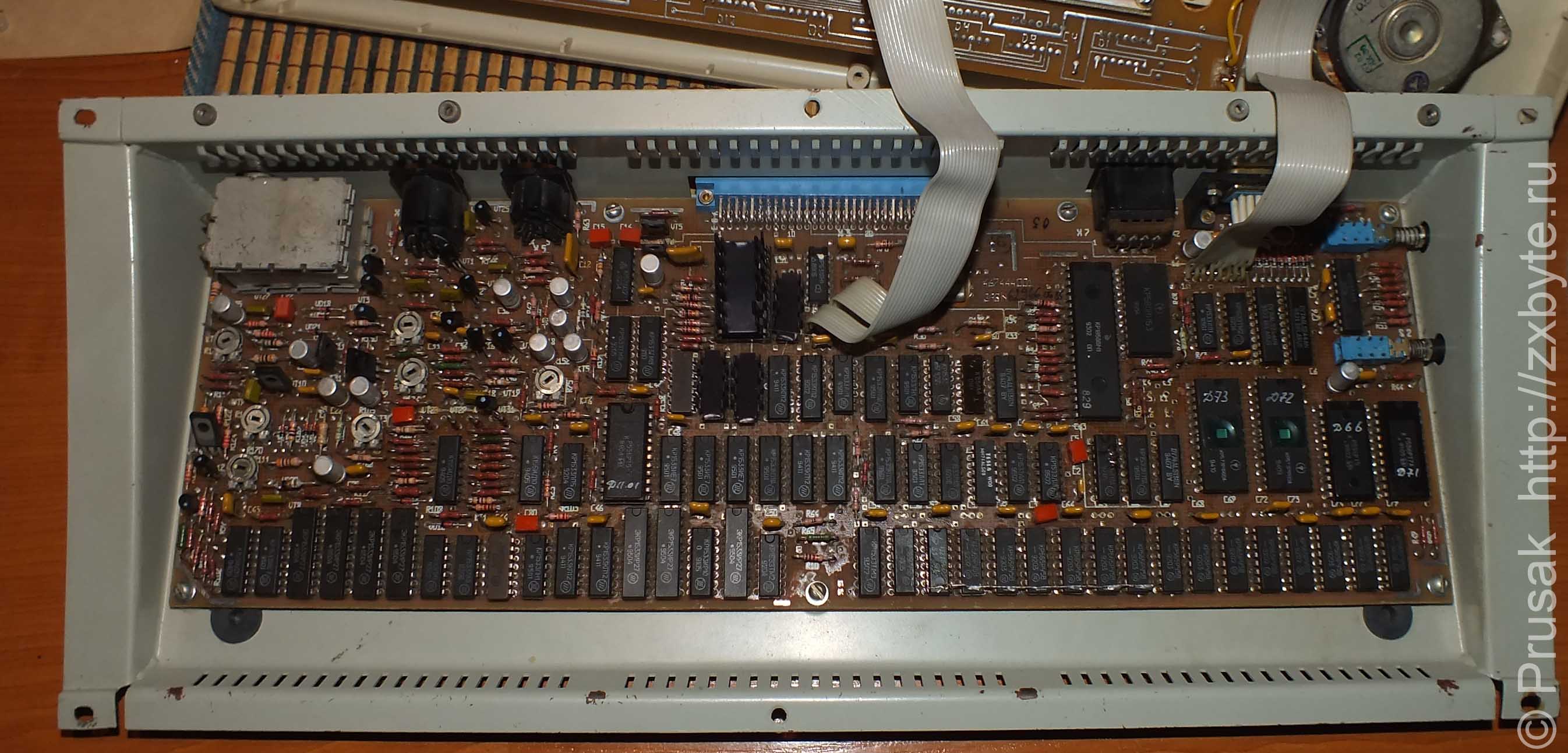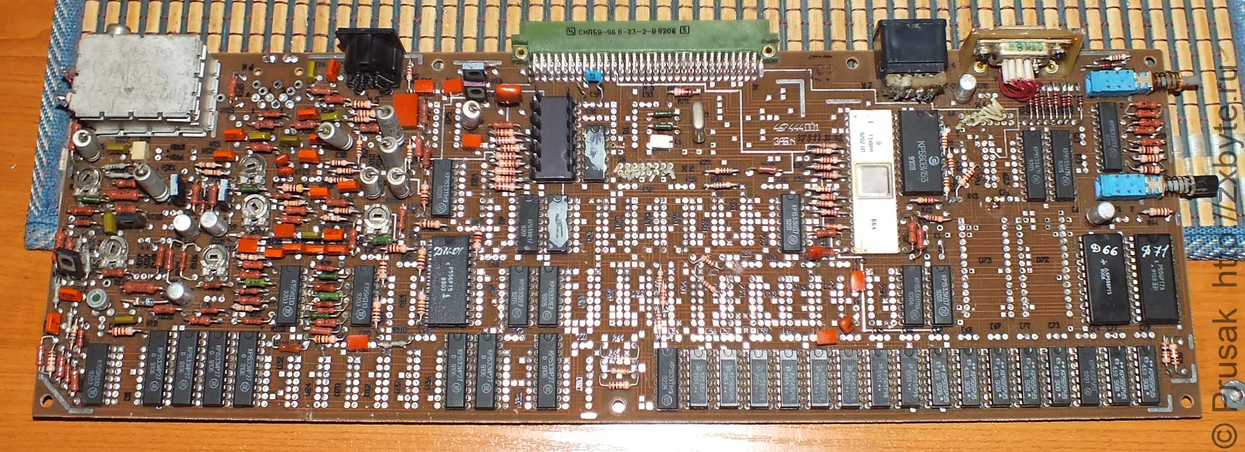 Поциент до лечения. На плате компьютера виден белый провод доработки для подключения TR-DOS. В левой части платы проводом МГТФ сделана инверсия синхросигнала для нормального подключения к телевизорам