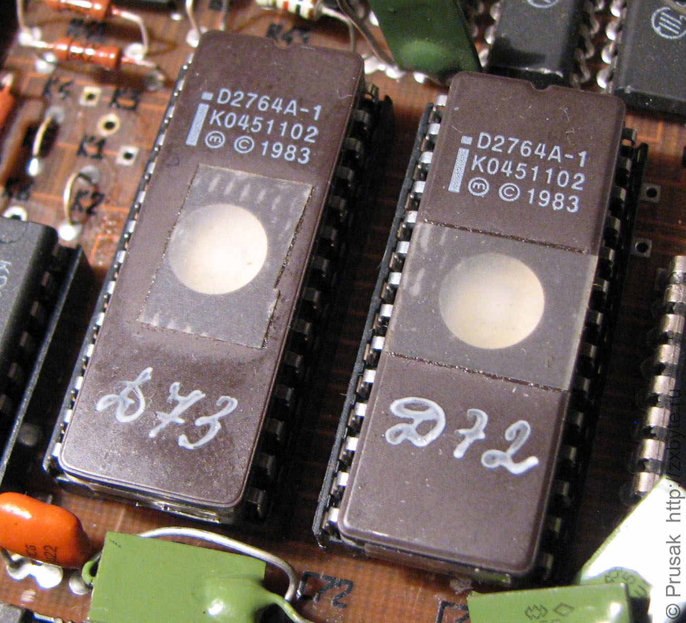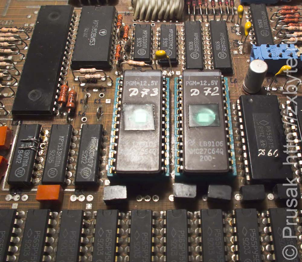 Что же касается типов ПЗУ, то обычно устанавливались импортные ПЗУ 2764 (фото было сделано на плате компьютера, где выгорели ПЗУ, поэтому новые ПЗУ стоят на панелях, но изначально они были впаяны в плату):