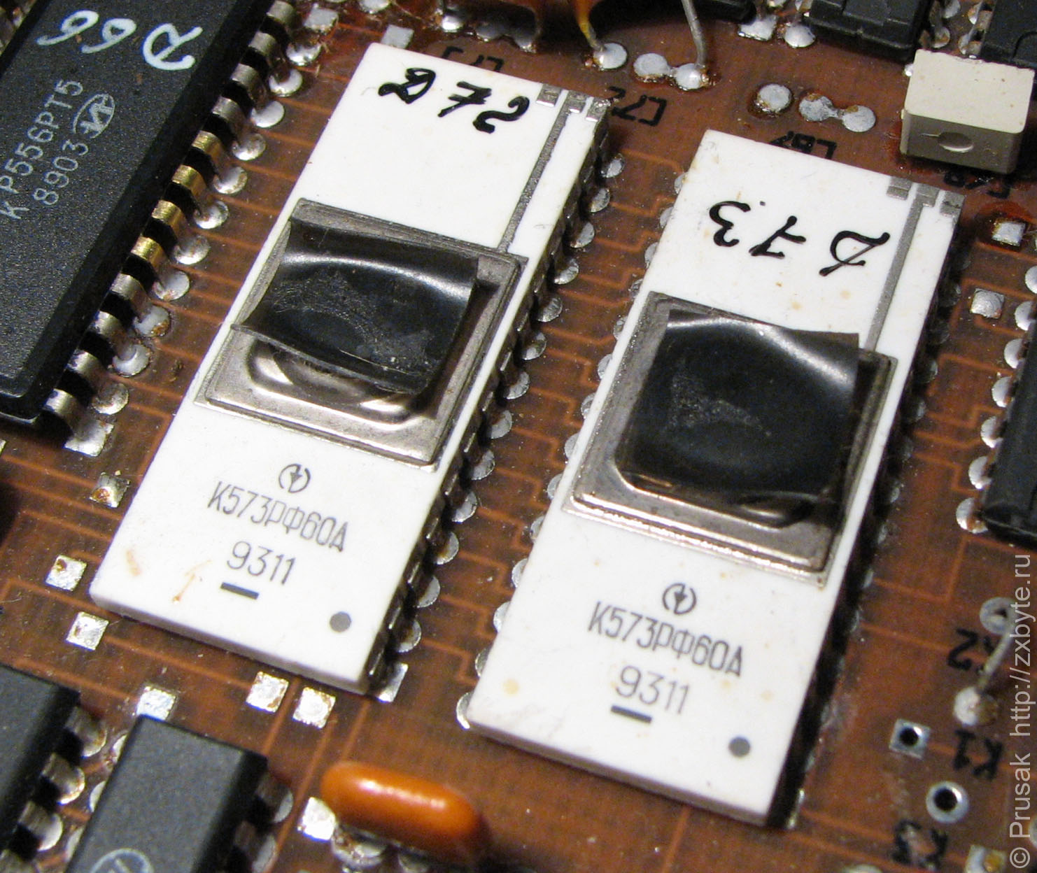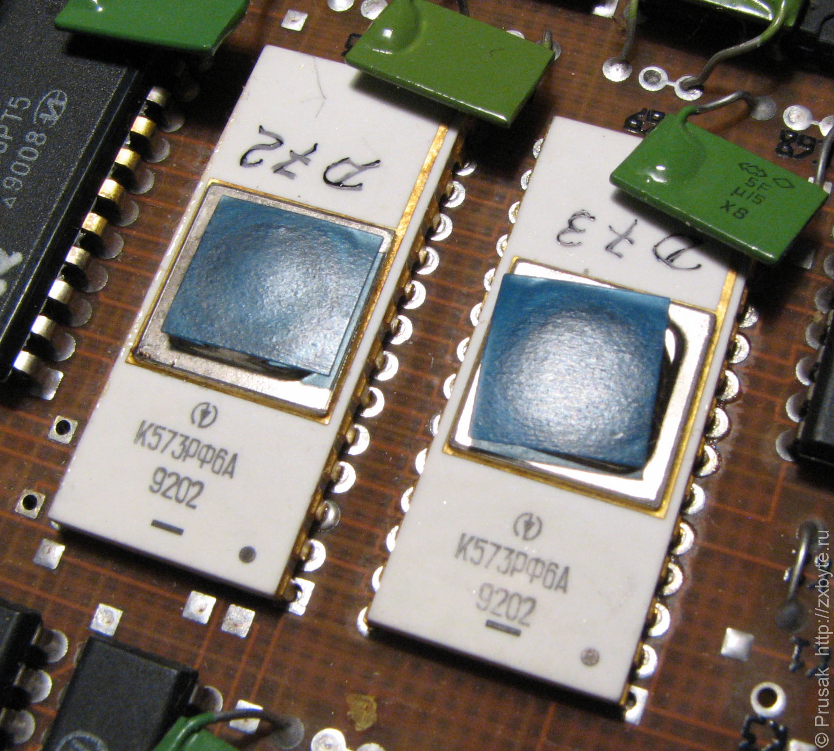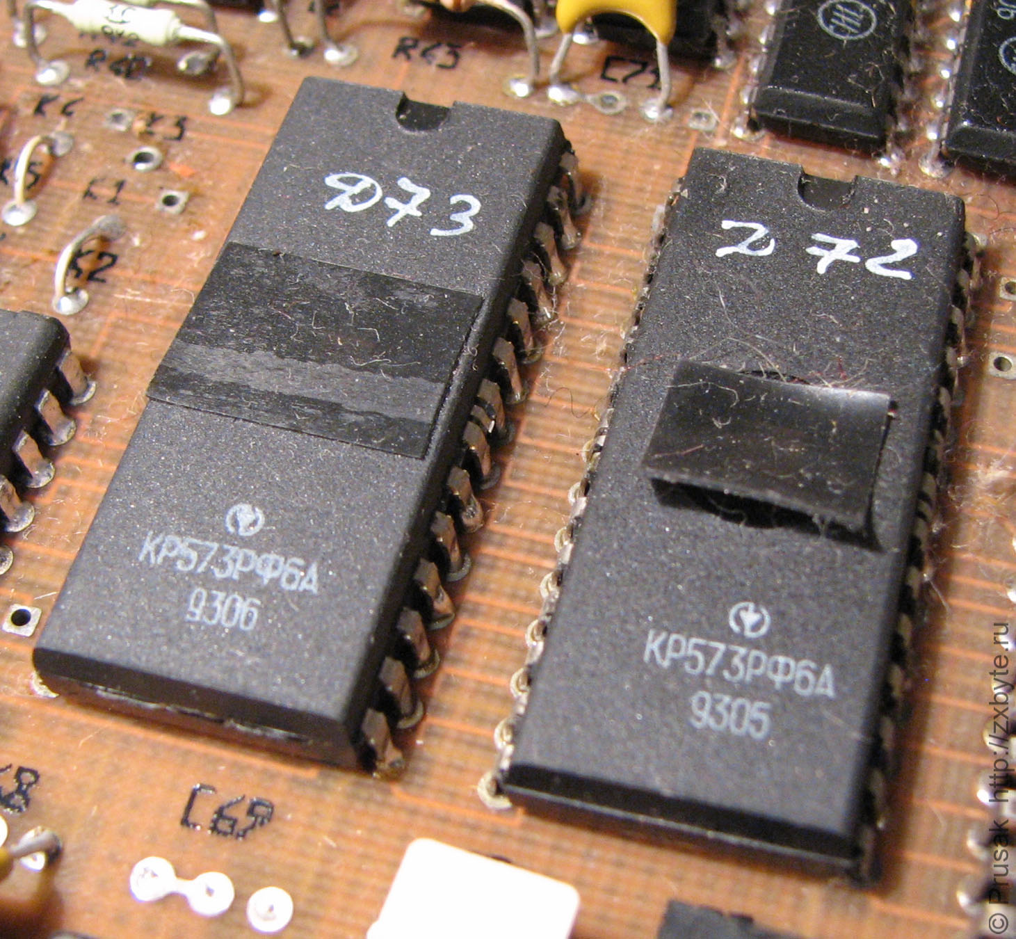 Все ПЗУ отмаркированы - на них краской написаны их порядковые номера по схеме, чтобы не спутать микросхемы при установке на плату.