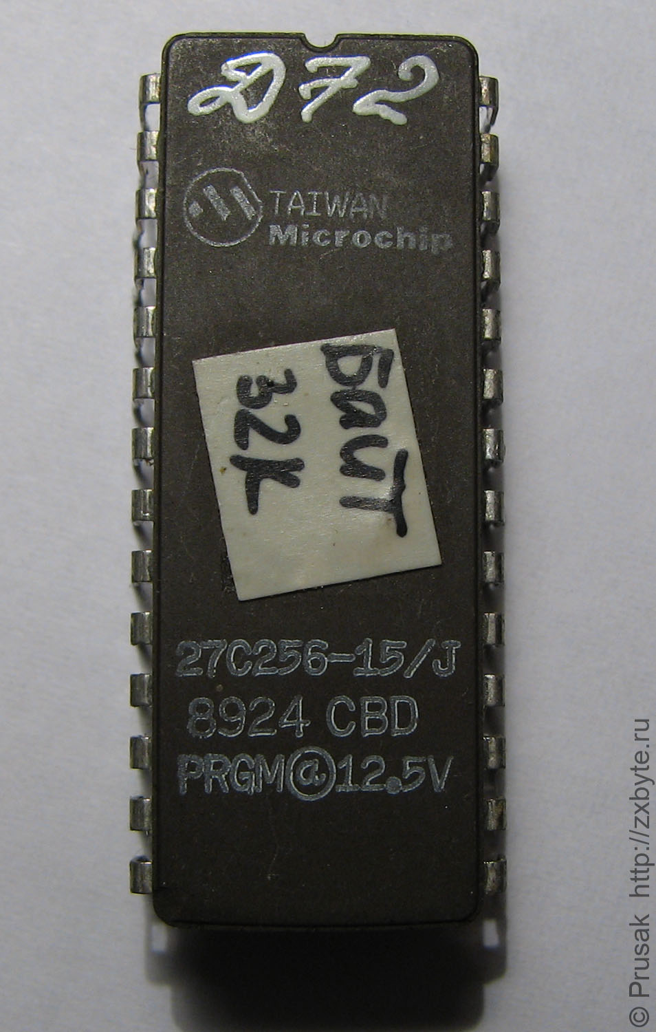 Бывали "Байты" с ПЗУ 27256. На проверку оказалось, что в нижних 16К ПЗУ чистое, а в верхних 16К расположена обычная "Байтовская" прошивка (на фотографии надписи маркером делал я сам). Почему прошивка была в верхних 16К? Потому что на вывод 27 ПЗУ DD72 подаётся лог.1, а для ПЗУ 27256 вывод 27 это сигнал A14, который выбирает нижние или верхние 16К ПЗУ, т.е. лог.1 выбирает верхние 16К.
