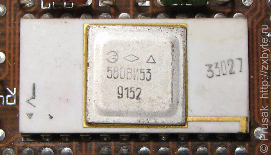 Интересная особенность КР580ВИ53 - при включении питания все три её канала устанавливаются в режим 3 (деление тактовой частоты) с коэффициентом деления 5602. При этом на выходах КР580ВИ53 будет частота 624,7 Гц. Это и есть то самое «пищание» из динамика при включении компьютера. Соответственно КР580ВИ53 приходится глушить, чтобы динамик противно не пищал. Для этого в прошивке бейсика для Байта есть специальная подпрограмма. И то, что при включении компьютера слышно гудение динамика на доли секунды - результат работы этой подпрограммы.