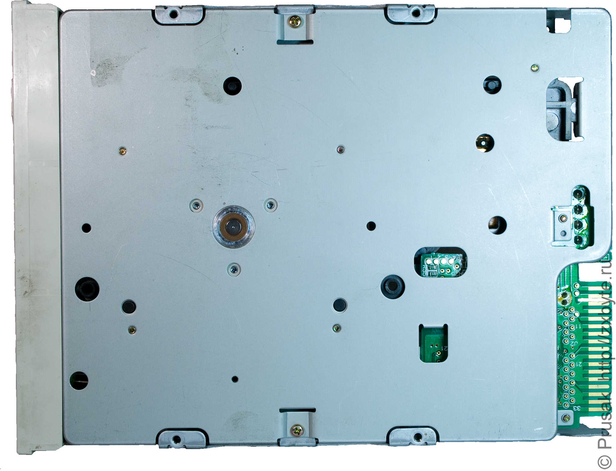 Дискета в накопителе фиксируется не флажком, а автоматически при вставке. При этом верхняя головка со всего размаха падаетНикаких систем плавного опускания головки, как это сделано на некоторых моделях трёхдюймовых дисководов, тут нет. на магнитный слой дискеты, что на мой взгляд негативно сказывается на длительности жизни дискеты.