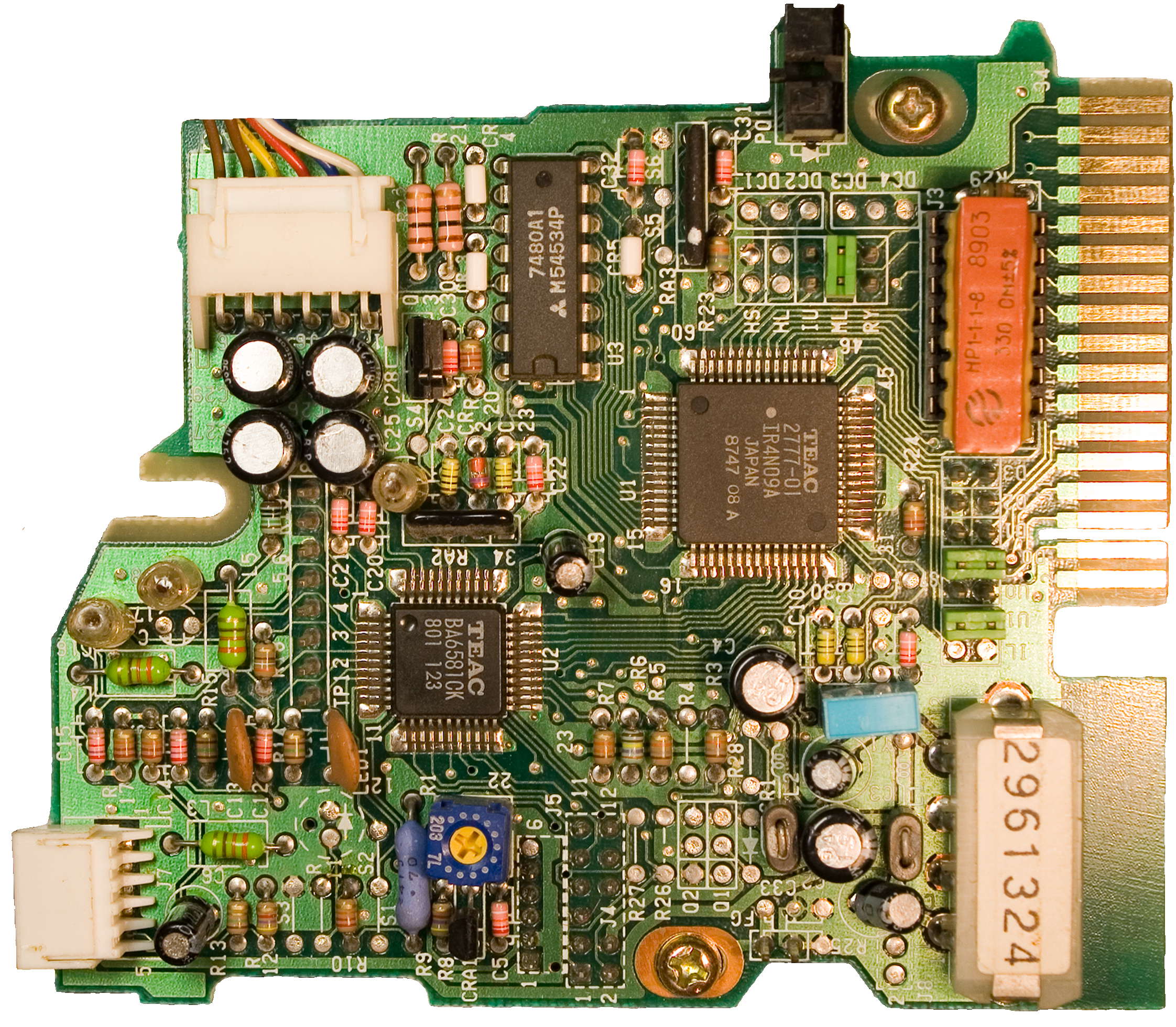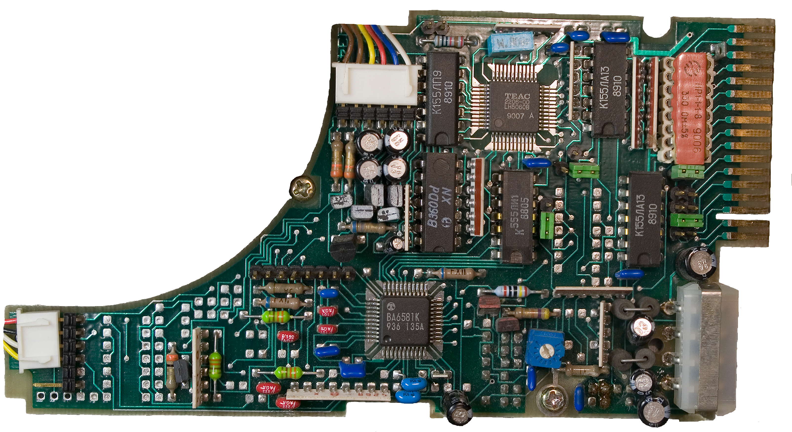 Насчёт этой платы у меня большие сомнения - это вообще-то плата контроллера от дисковода Robotron, и непонятно что она делает в накопителе Teac. Хотя известно, что в этой плате разводка разъёмов для подключения шагового двигателя, блока головок и т.п. одинакова с приводами Teac. Поэтому буду считать с большой натяжкой, что это плата от Teac.