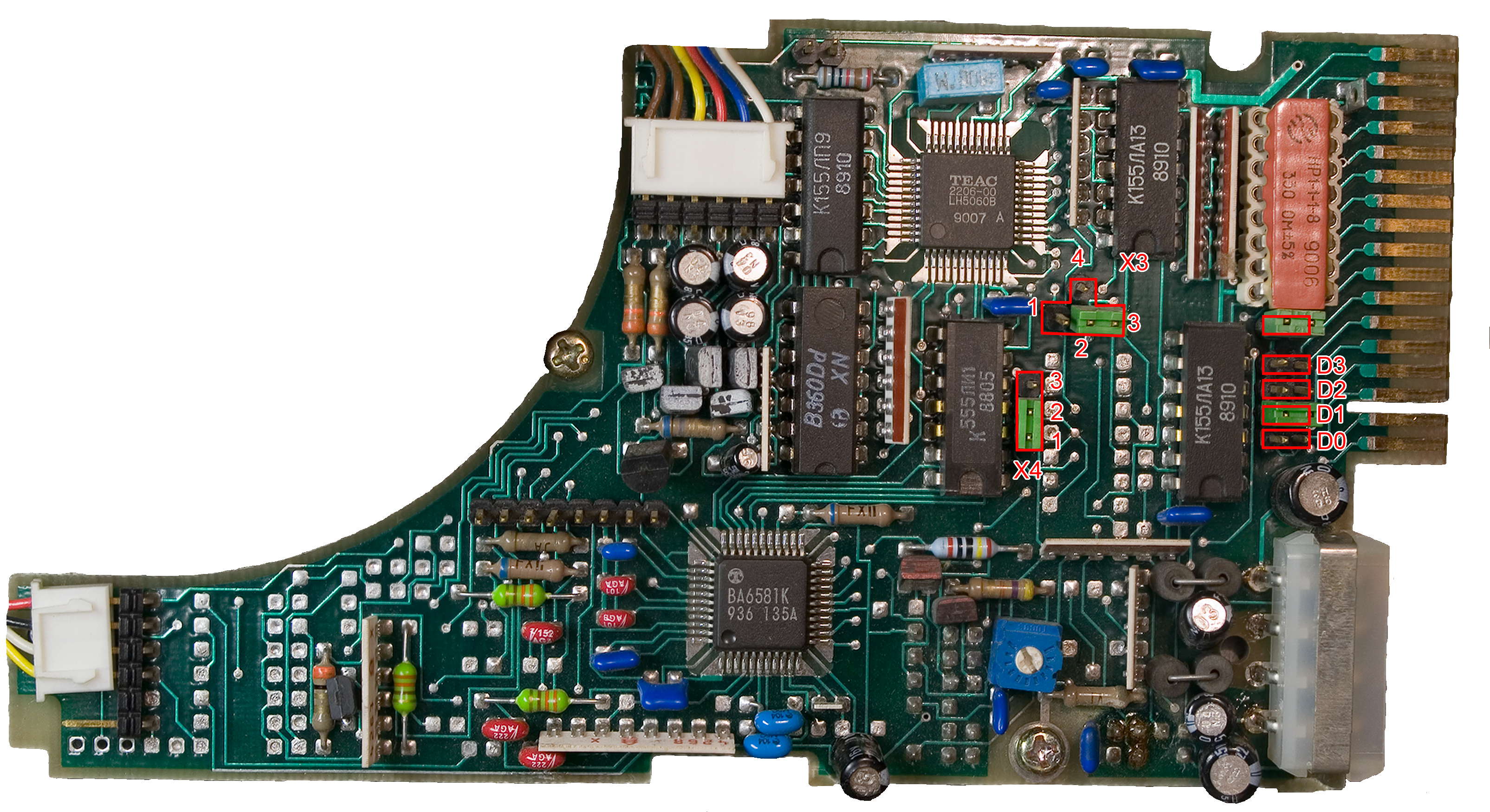 Немного информации по расположению перемычек на известных мне вариантах плат контроллера дисководов Teac: