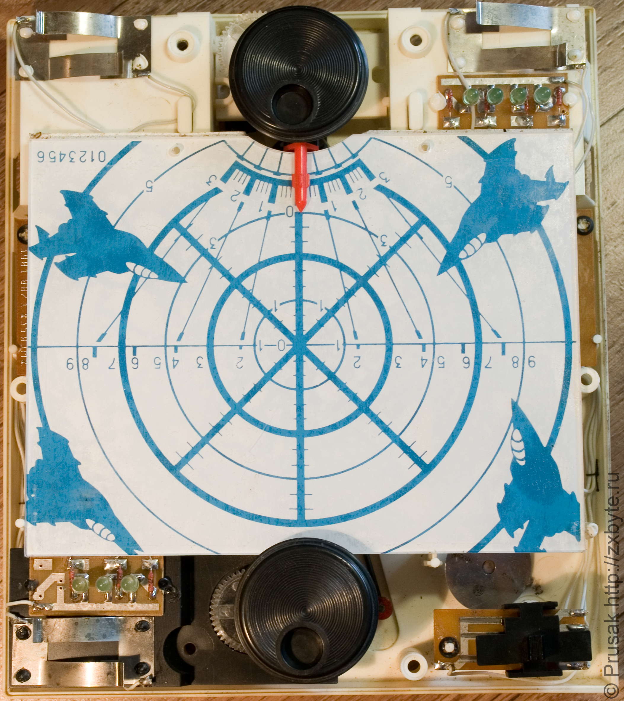 Всё гениальное просто. Путём совместного использования механических элементов и несложной электроники получилась отличная игра. Видно, что самолёт и ракета перемещаются внутри игры на своеобразных «штангах». В момент их совмещения замыкается цепь, определяющая момент «взрыва» самолёта. Дальше - дело техники: обеспечить мигание самолёта, анимацию движения ракеты и подсчёт очков.