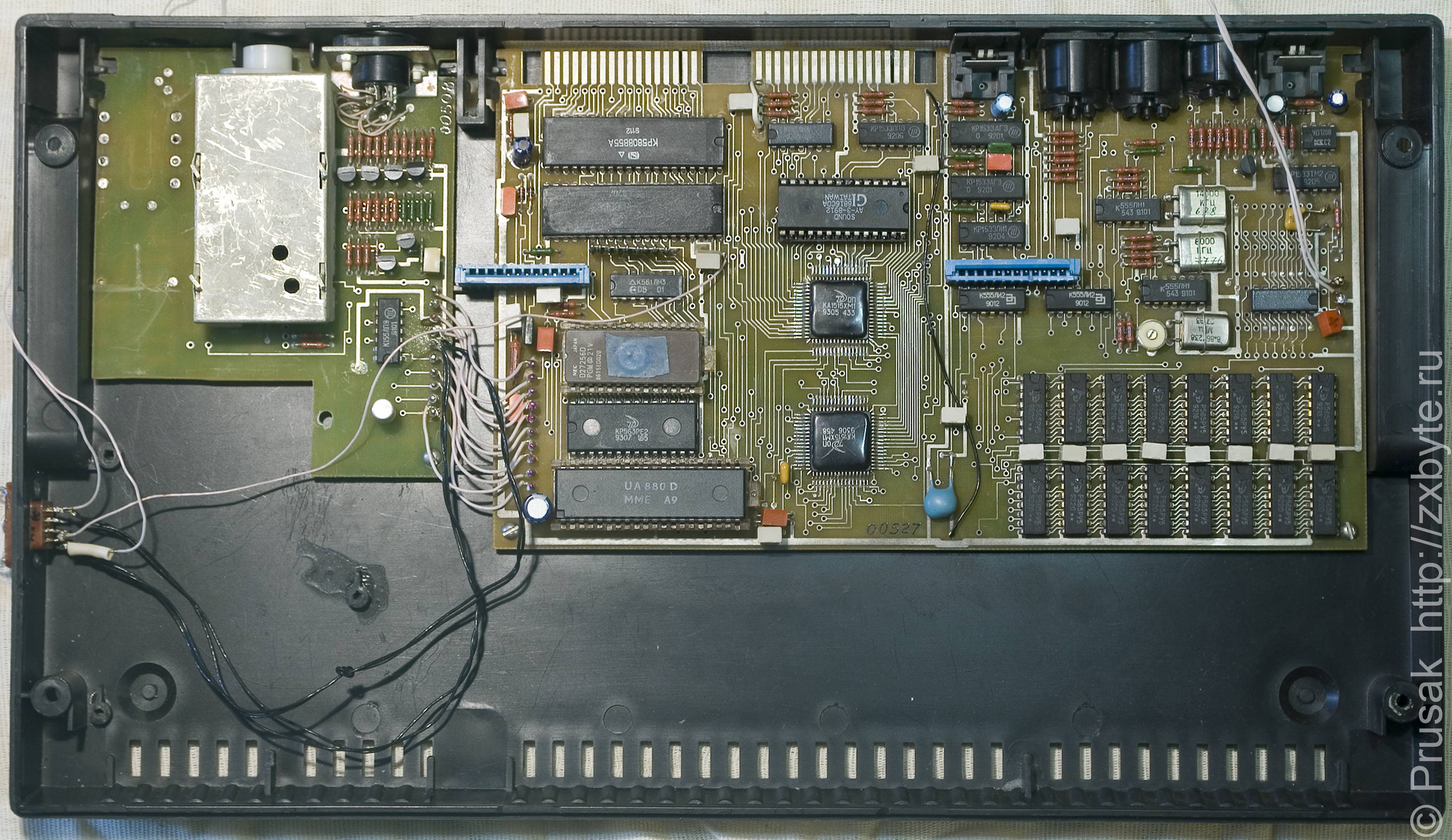 Справа - основная плата компьютера. Слева - плата стабилизатора питания и видеовыхода. Кроме стабилизатора тут расположены выходные каскады RGB-выхода и ВЧ-кодер.