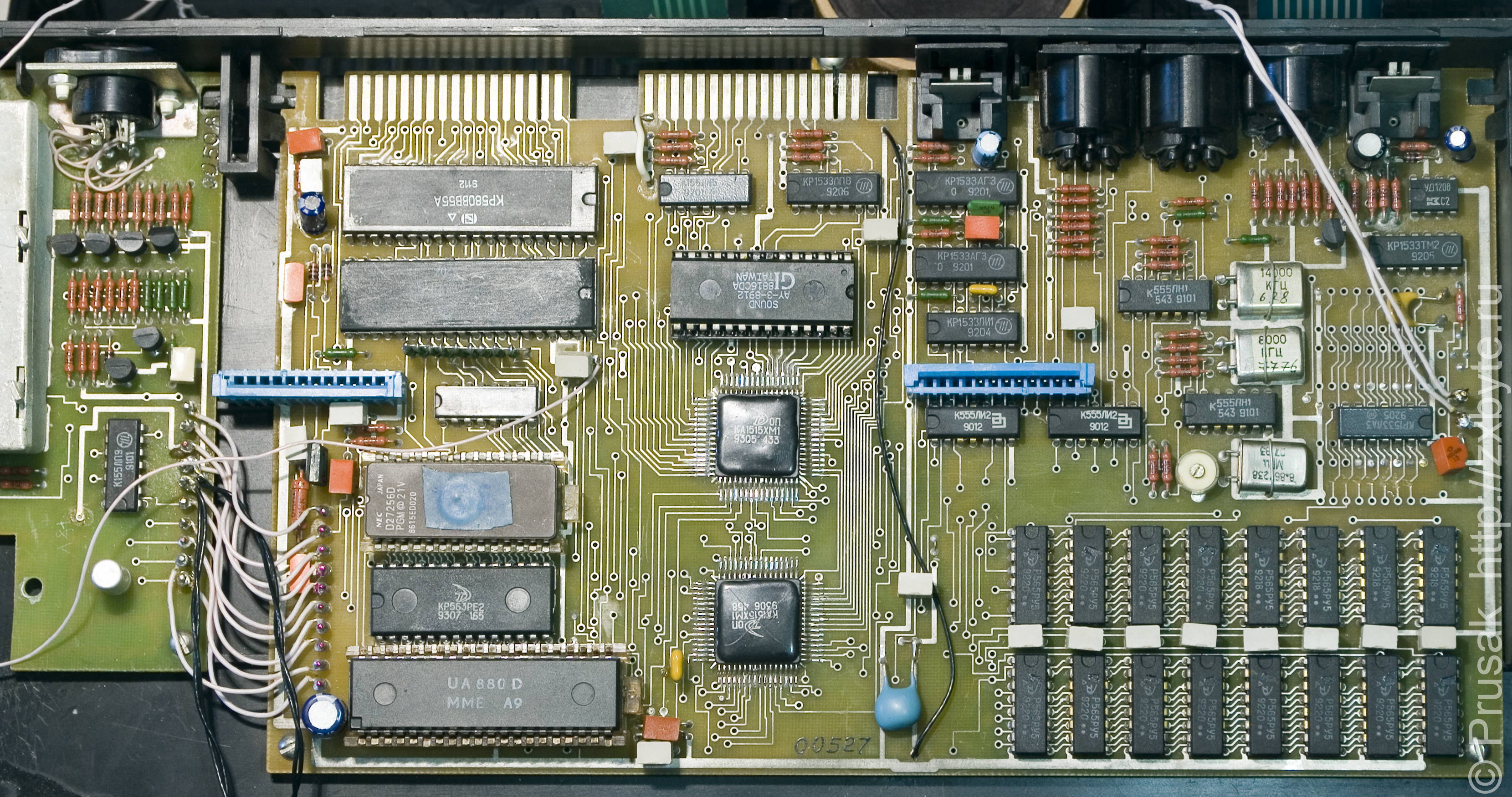 Кварц на 14МГц тактирует процессорную часть компьютера, кварц на 8МГц - контроллер дисковода, а кварц на 8,867238 МГц отвечает за тактирование видеоконтроллера. Вероятнее всего компьютер должен выдавать цветное изображение в системе PAL. К сожалению проверить это я не смог.