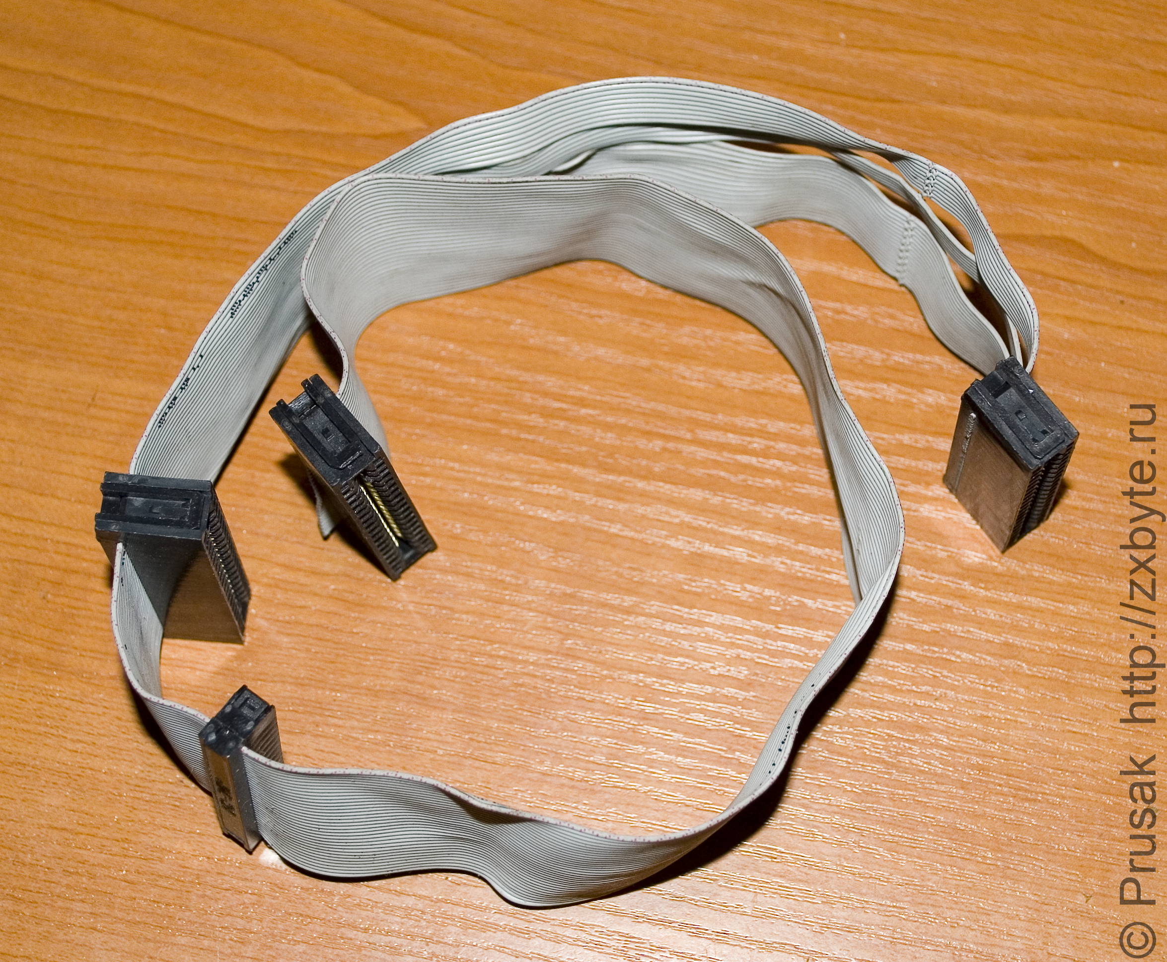 Разъём для подключения дисковода сделан очень правильно, без всяких ухищрений - в виде такой же «гребёнки», как на дисководе. Благодаря этому для подключения дисковода можно использовать обычный ленточный шлейф от старых IBM PC, только надо убрать «перевёрнутый» кусок шлефа: