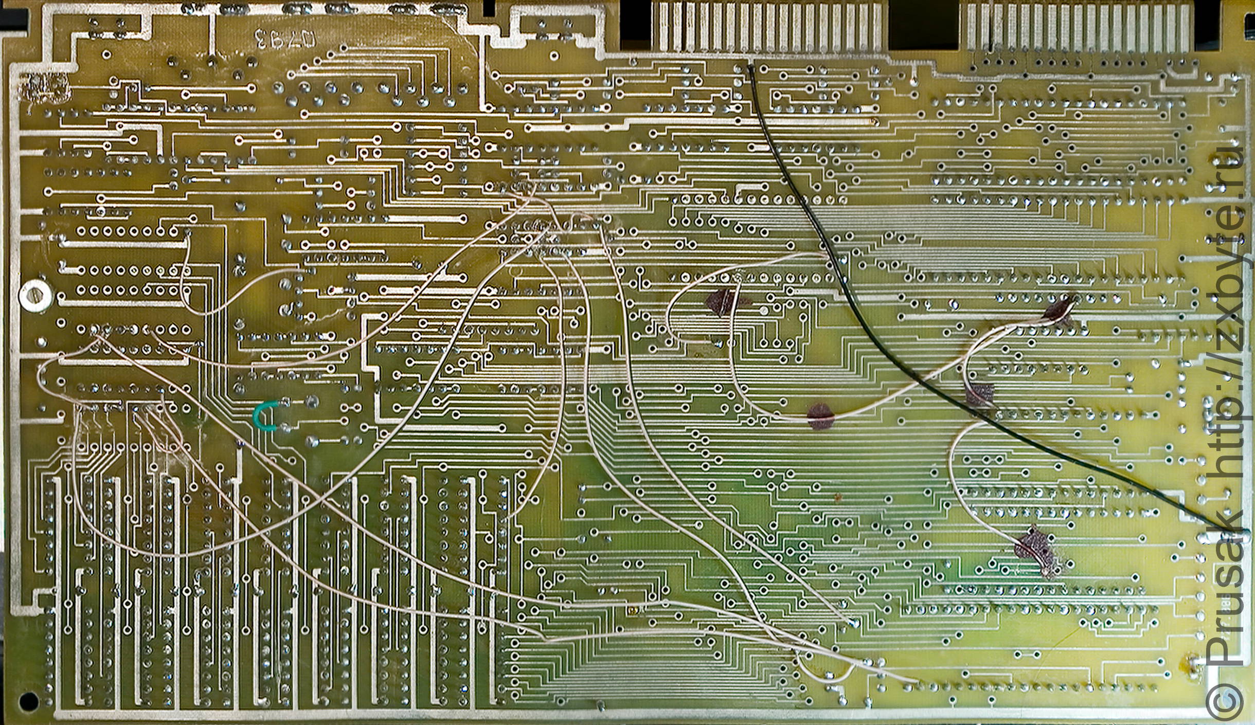 Плата довольно аккуратно разведена и спаяна. Глаз радует. Жаль, что нет позиционных обозначений элементов. Благодаря использованию микросхем БМК плата компьютера имеет малое количество корпусов микросхем: сами БМК, память ОЗУ 128КБ, выполненная на 16-ти микросхемах КР565РУ5, ПЗУ, процессор, музыкальный синтезатор, КР1818ВГ93, параллельный порт КР580ВВ55 для подключения принтера и немного мелкой логики. Довольно компактно.