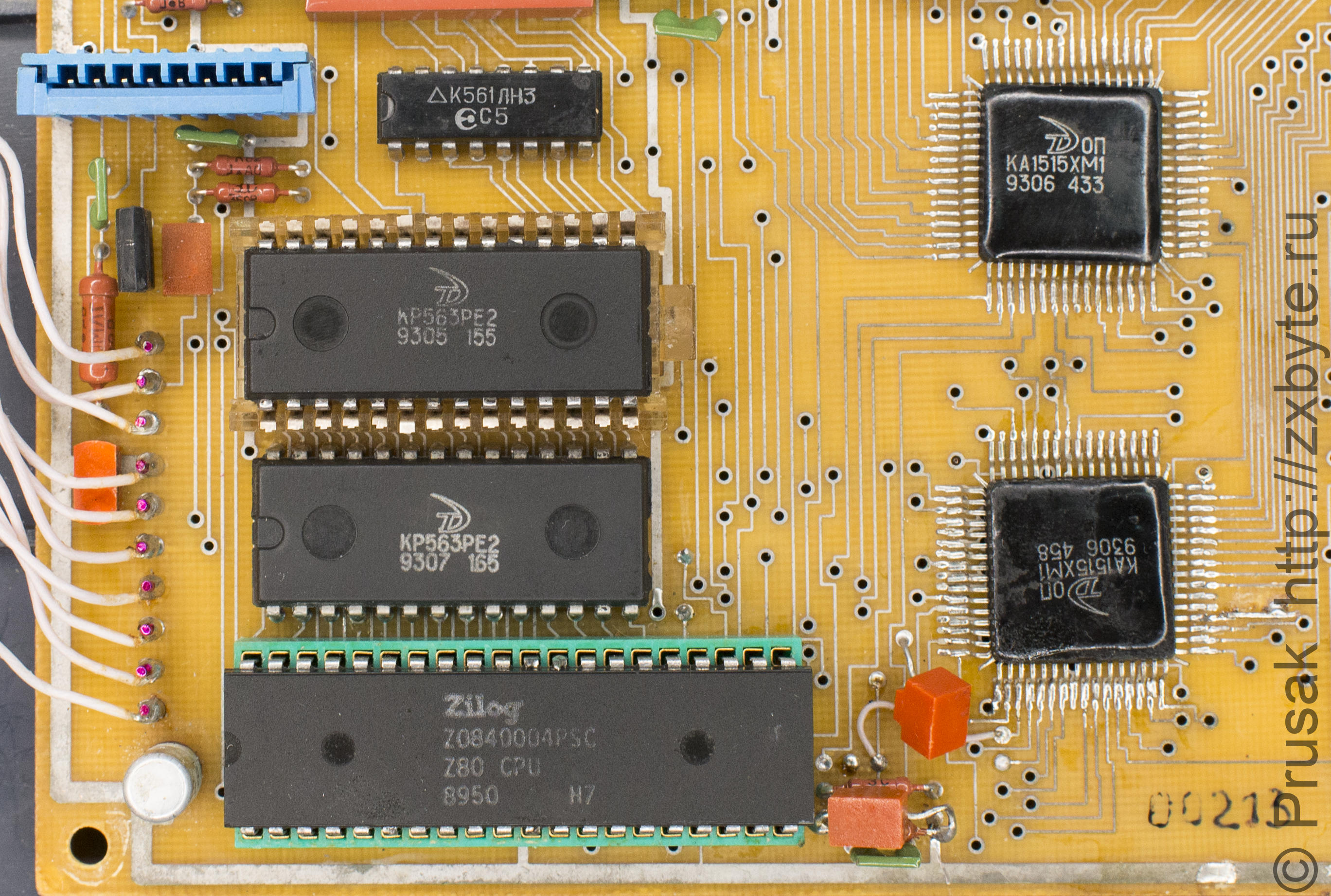Объём ОЗУ составляет 128КБ. Плата компьютера разведена с возможностью использования как 16 микросхем ОЗУ типа КР565РУ5, так и 4-х микросхем типа КР565РУ11 (4464). Однако на том месте, где должны устанавливаться микросхемы 4464, на всех встреченных мной компьютерах прямо на заводе была сделана доработка на КР1533ЛА3 для формирования тактового сигнала процессора. Предположу, что после разводки и изготовления партии печатных плат компьютера обнаружилась некая недоработка, для устранения которой потребовалась дополнительная микросхема, и для установки этой микросхемы пришлось «пожертвовать» возможностью установки микросхем КР565РУ11.