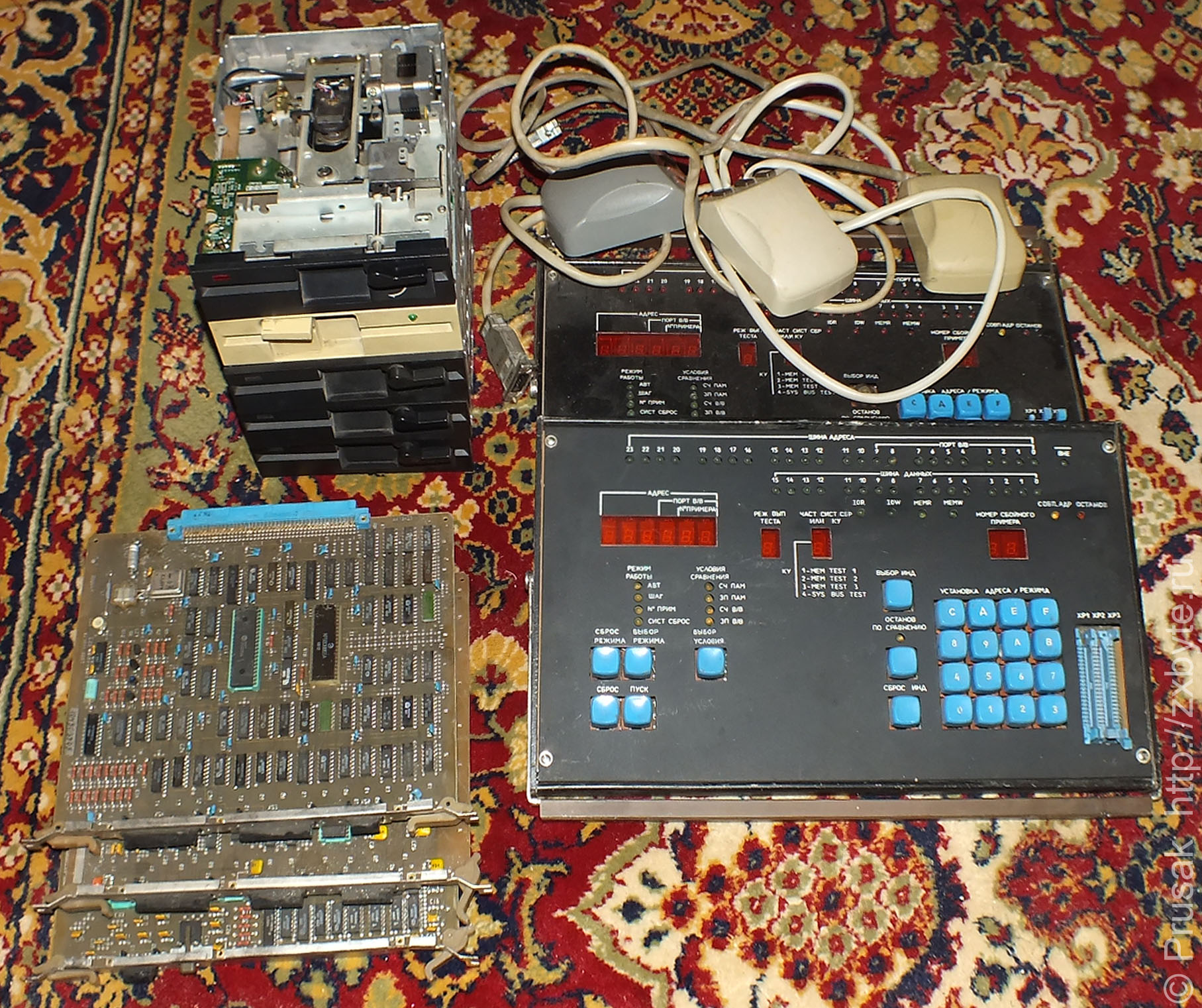 Взяв в компаньоны Byteman'а мы пошли по местным злачным местам в поисках раритетного хлама. После недолгих поисков нам было предложено несколько заветных мышей от ЕС-1841. Продавец намекнул, что "гусары денег не берут", посему пришось оперативно бежать в местный булдырь за тремя пузырями пива, после чего мыши переместились в наши руки. Мужику наверное было скучно, потому как он не спешил уходить и употребил часть пива прямо на месте сделки, после чего, подобрев, сообщил что за более высокий градус подгонит нечто особенное. Пришлось снова посетить булдырь и затариться огненной водой. Продавец тем временем откуда-то припёр ящик, в котором оказалось штук 10 пятидюймовых дисководов, набор плат от ЕС-1841 и два непонятных девайса, похожих на какие-то отладочные модули. После расчёта бартером продавец удалился отмечать удачный день, а мы вдвоём попёрли тяжёлый хлам домой. Добытые раритеты были разделены по-братски. Платы от ЕС-ок пришлись очень кстати, потому что позарез требовалась мелкая логика для различных поделок, а на этих платах микросхем очень много. Одних только КР565РУ5 после распайки модуля памяти хватит, наверное, на долгие годы.