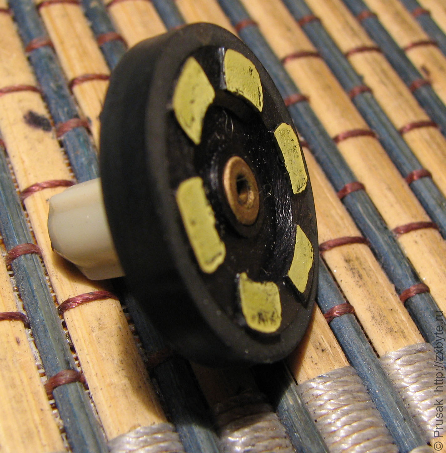 В конструкцию магнитофона введён автостоп. Суть его работы в следующем: на обратную поверхность шкива подкассетного узла нанесены светлой краской риски: