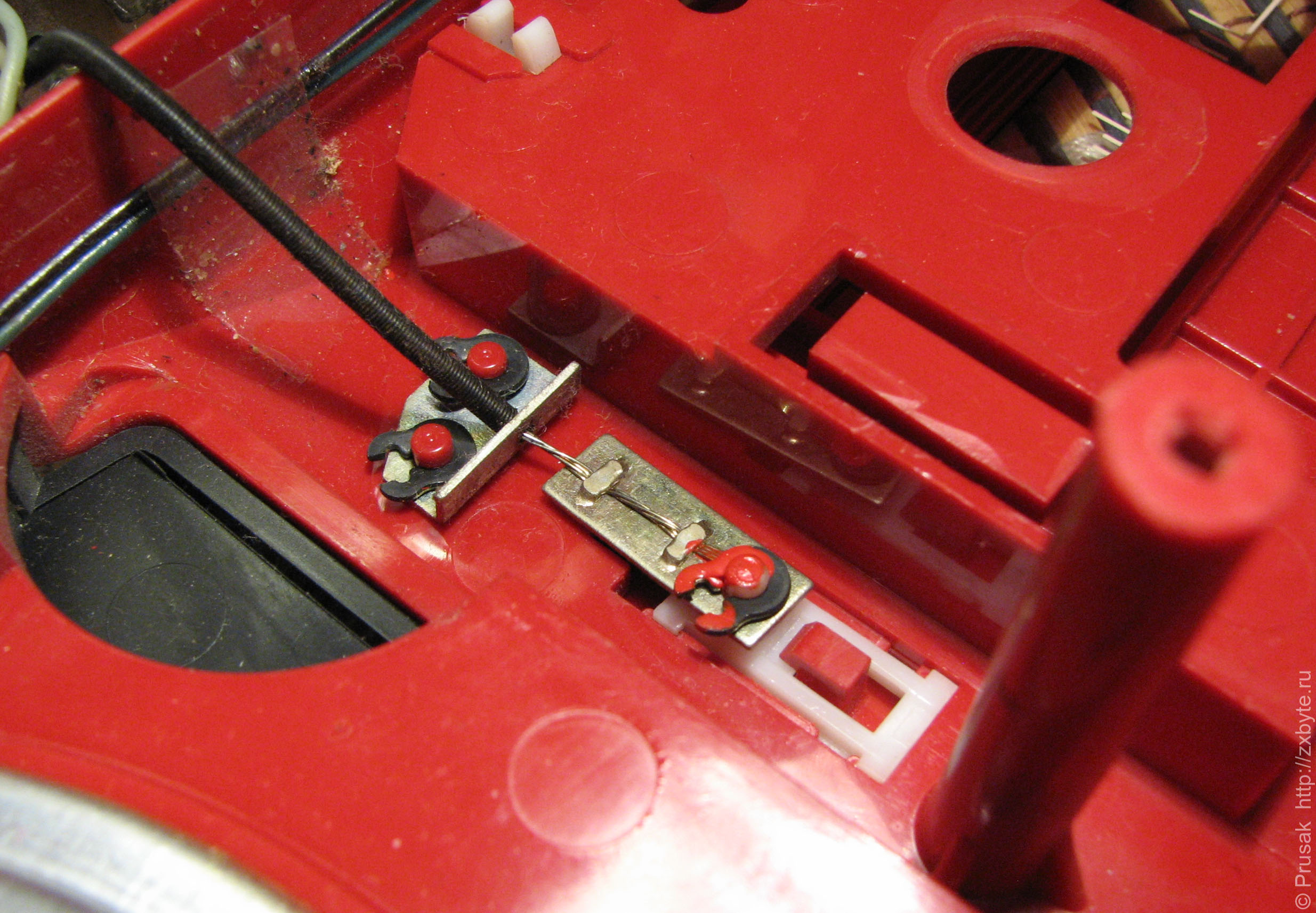 Также при помощи тросика включается режим записи. При нажатии кнопки "запись" усилие через тросик передаётся на многоконтактный переключатель П2К, переводящий магнитофон в режим записи.