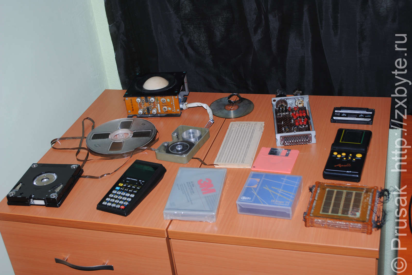 Сразу у входа расположены различные виды древних накопителей информации (ламповый триггер от ЭВМ "Минск-1", ЗУ на ферритовых кольцах, накопители на магнитной ленте, дискеты):
