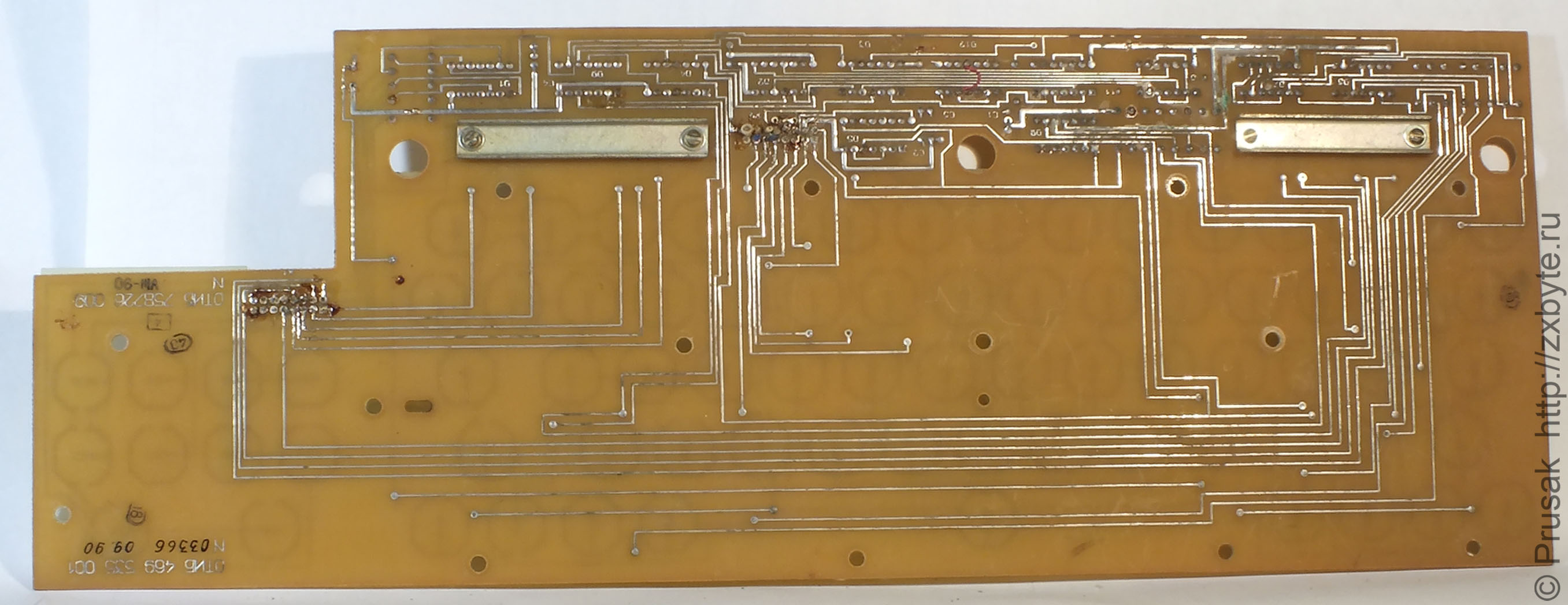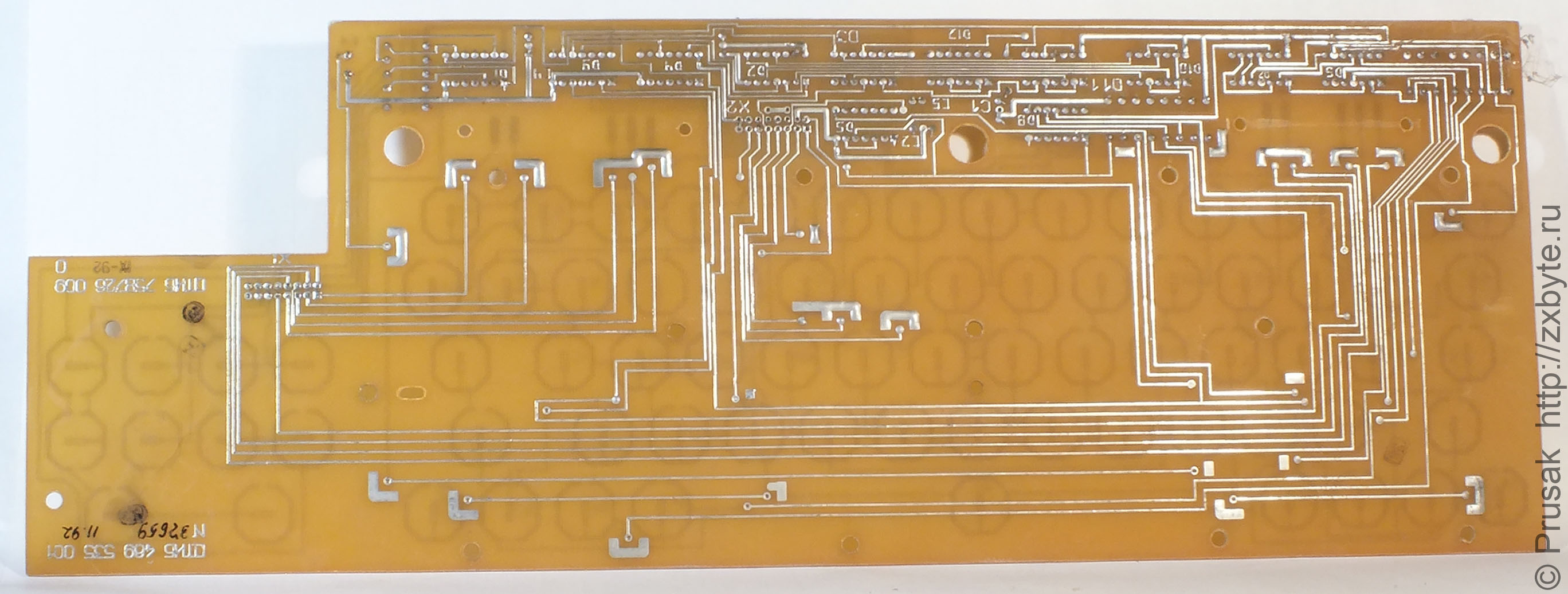 В обычном Байте у некоторых переходных отверстий есть что-то типа «окантовки» из печатных дорожек, в то время как в «старом» Байте такого нет. Ну и с позиционными обозначениями элементов та же самая беда, что и для основной платы - их попросту нет. В остальном платы клавиатуры ничем не отличаются.