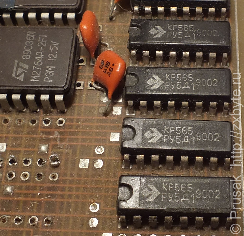 В зависимости от используемого типа «отбраковки» перемычка K1-K2-K3 должна была ставиться как K1-K2 для КР565РУ5Д1 и K1-K3 для КР565РУ5Д2. Всё дело в том, что в зависимости от типа микросхемы-«отбраковки» Д1 или Д2 в ней были работоспособны либо нижние 32КБит памяти, либо верхние 32КБит. Соответственно перемычка K1-K2-K3 отвечала за работу с верхними или нижними половинками РУ5-х.