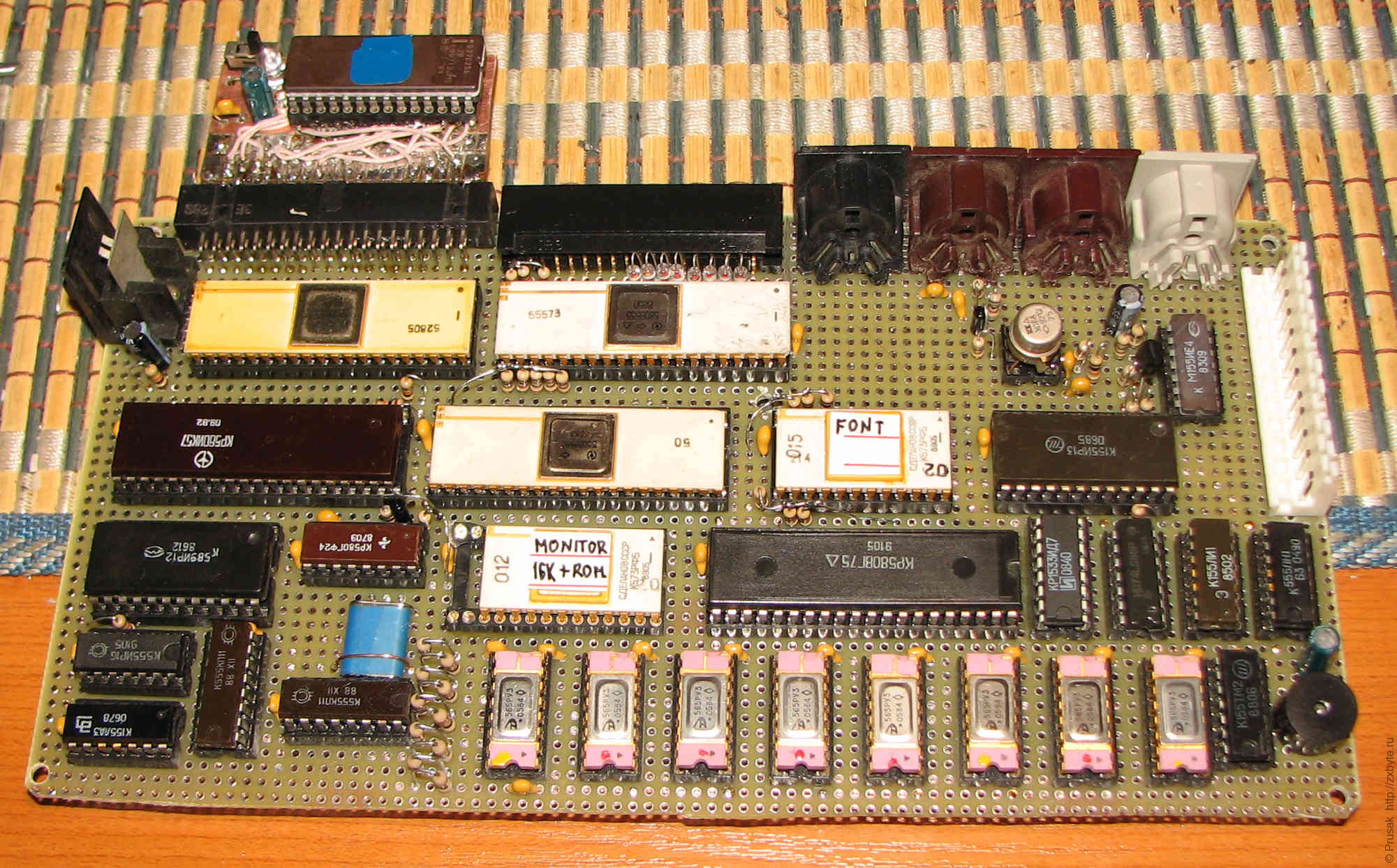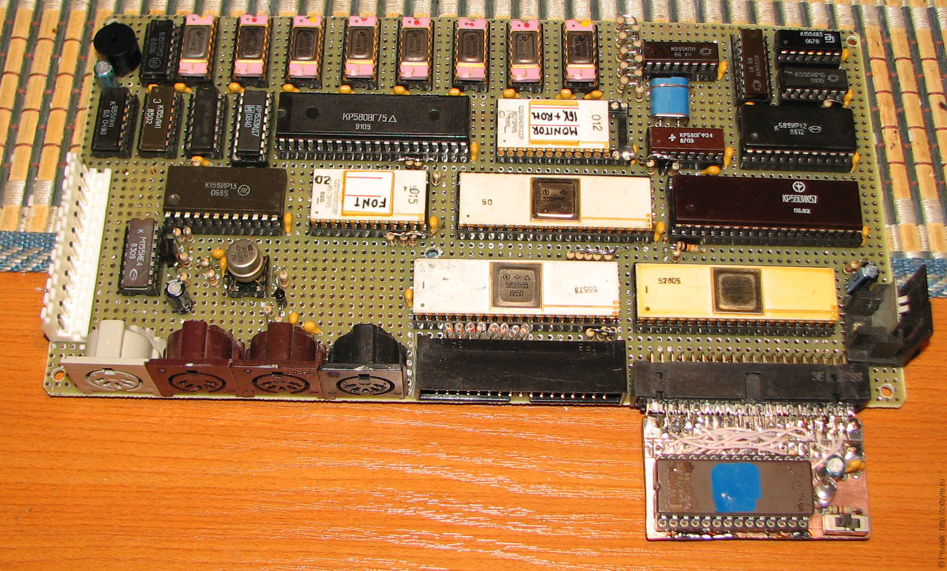 По возможности для платы компьютера подбирались старые микросхемы 155-й серии и "жёлтые" БИС КР580 и КР565РУ3, чтобы красиво смотрелось.