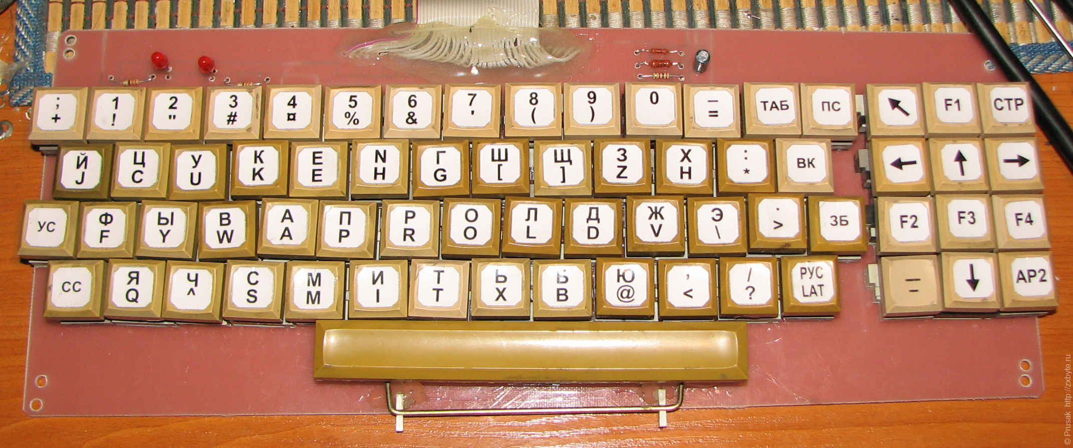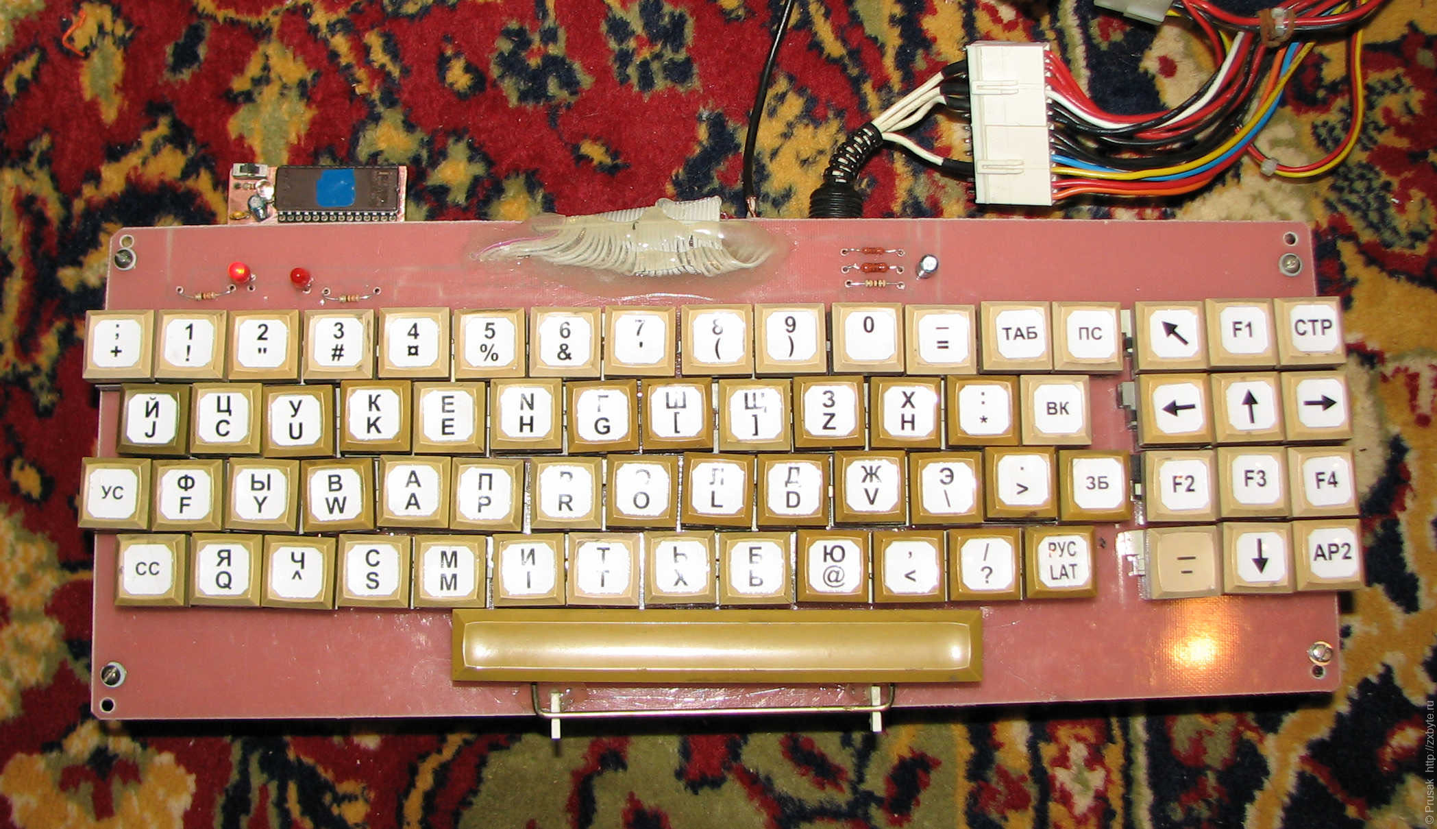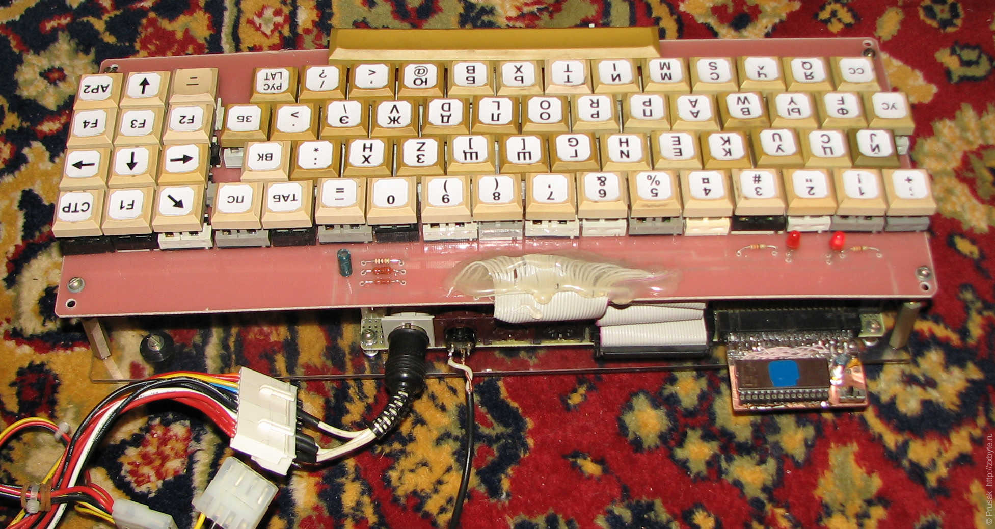 Клавиатура собрана из распаянной клавиатуры от ЕС-1840. Наклейки на клавиши печатались на лазерном принтере, ламинировались прозрачным скотчем и клеились на двусторонний скотч: