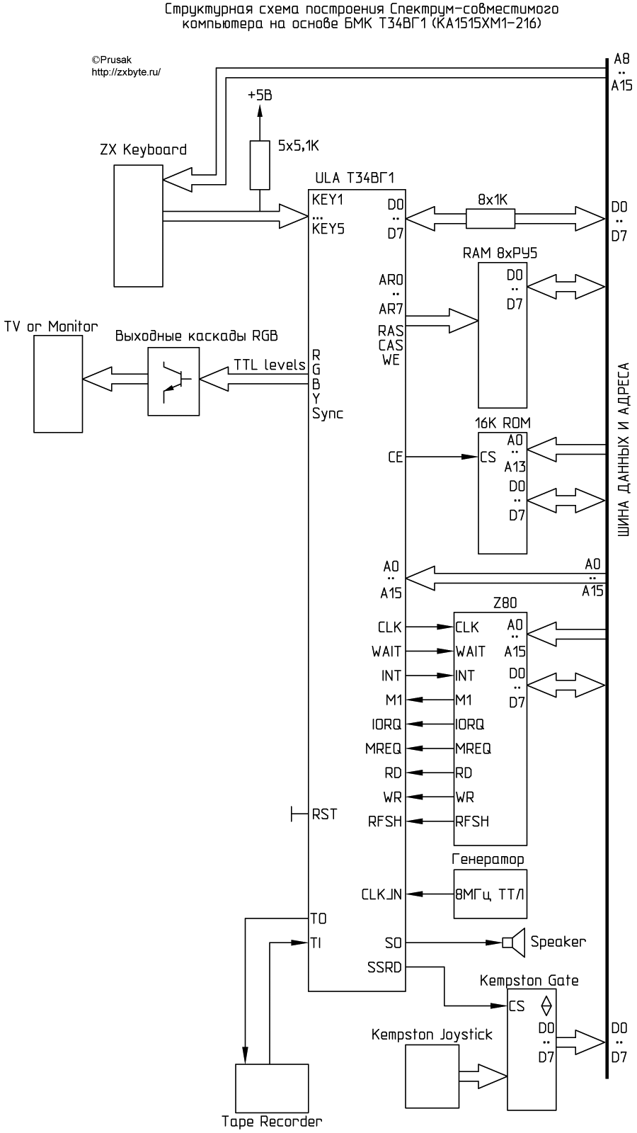 Для построения Спектрума на Т34ВГ1 требуется по сути соединить между собой через одноименные контакты процессор, 16К ПЗУ, 64К ОЗУ (8 микросхем РУ5 или две микросхемы РУ11), клавиатуру и (при необходимости) Kempston джойстик. В схематичном виде это можно представить следующим образом: